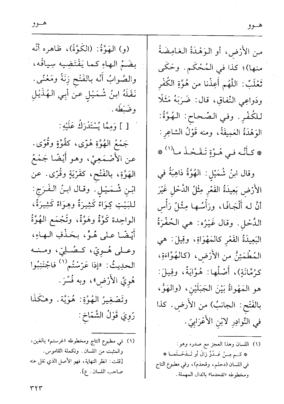 وتُجْمَعُ} الهُوَّةُ أَيْضاً على هُوَ، بحذْفِ الهاءِ، وعَلى {هُوِيَ، كصُلِيَ؛ وَمِنْه الحديثُ: (إِذا عَرَّسْتُم فاجْتَنِبُوا هُوِيِّ الأرضِ) ، وَبِه فُسِّر.