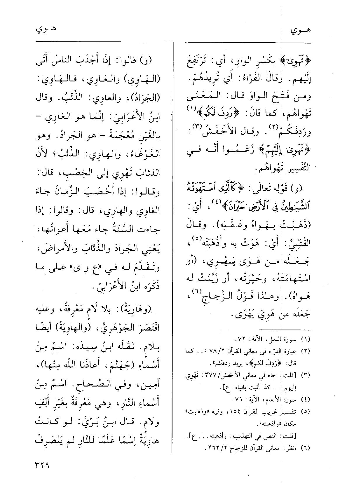 وقالَ الفرَّاء: أَي تُرِيدُهم. ومَنْ فَتَح الْوَاو قالَ المَعْنى} تَهْوَاهُم، كَمَا قَالَ: رَدِفَ لكُم ورَدِفَكم؛ وقالَ الأخْفَش: {تَهْوى إِلَيْهِم زَعَمُوا أنَّه فِي التَّفْسِيرِ تَهْواهم.