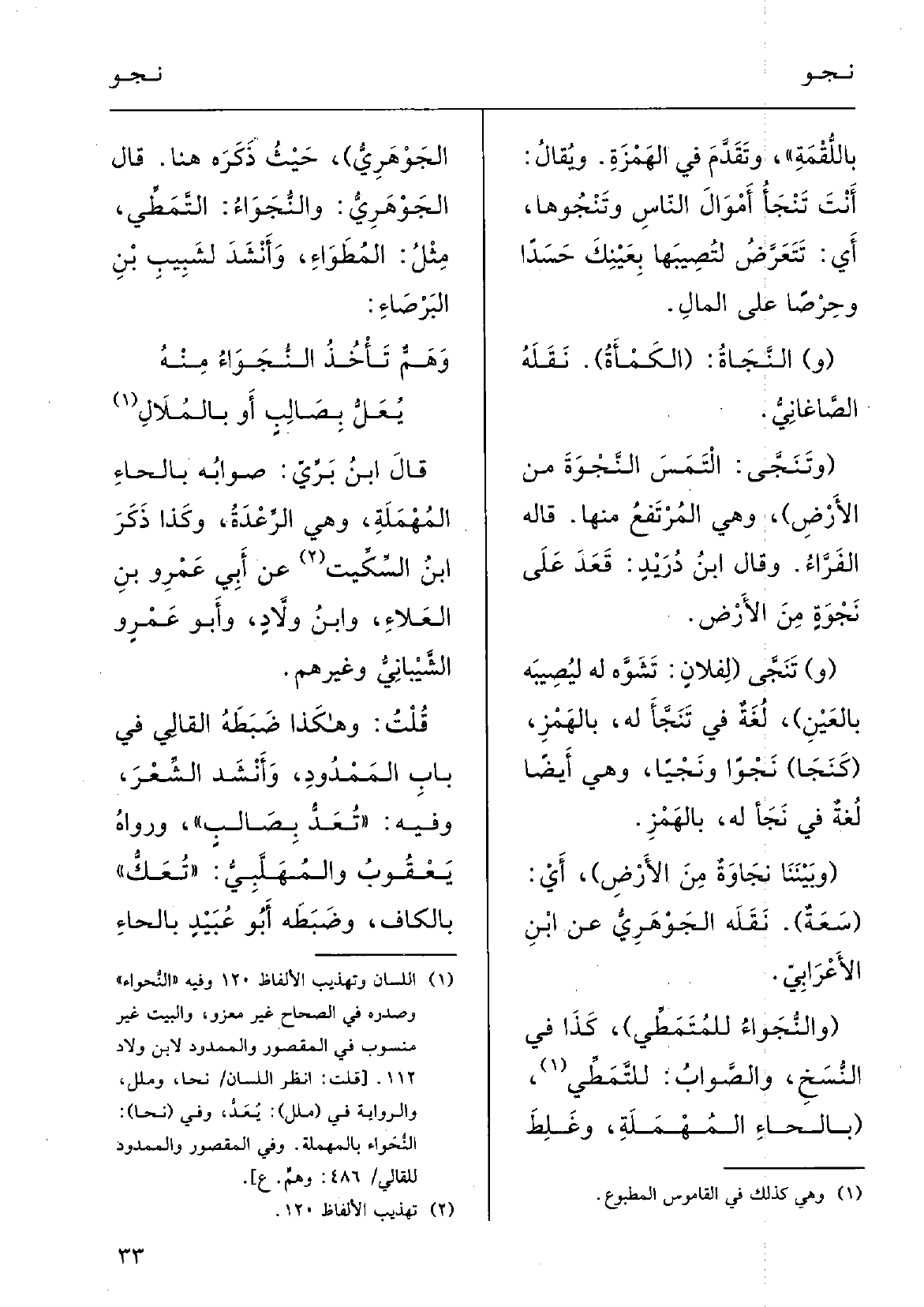 باللّقْمةِ) ، وتقدَّمَ فِي الهَمْزة، ويقالُ: أَنتَ تنجأ أَمْوالَ الناسِ {وتَنْجوها، أَي تَتَعرَّضُ لتصِيبَها بعَيْنِك حَسَداً وحِرْصاً على المالِ (و) } النَّجاةُ: (الكَمْأَةُ) ؛ نقلَهُ الصَّاغاني ( {وتَنَجَّى: الْتَمَسَ النّجْوَةَ مِن الأرضِ) ، وَهِي المُرْتَفِعُ مِنْهَا؛ قالَهُ الفرَّاء.
