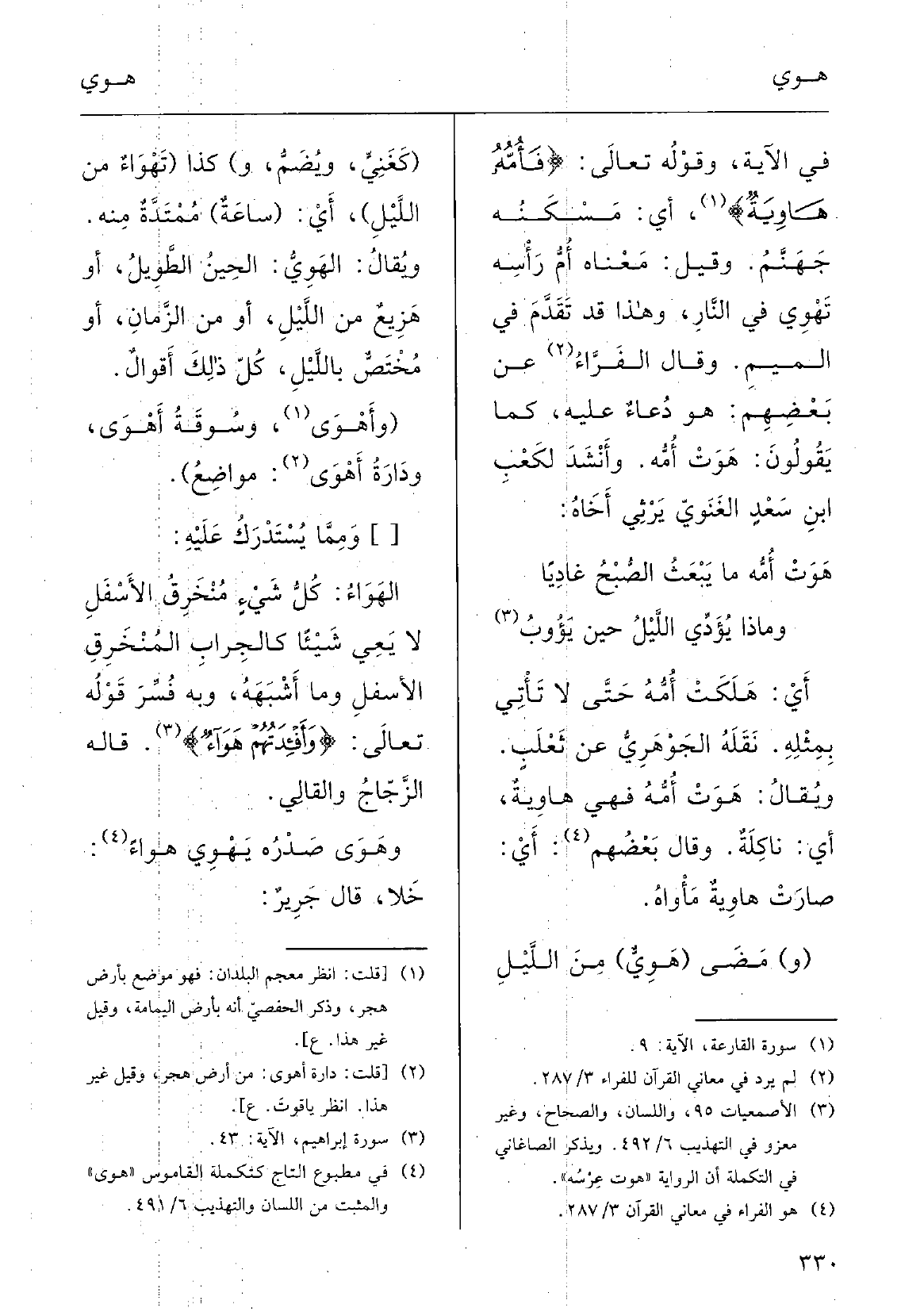 فِي الآيةِ؛ وقولهُ تَعَالَى: {فأُمُّه {هاوِيَةٌ} ، أَي مَسْكَنُه جَهَنَّم، وقيلَ مَعْناهُ: أُمُّ رأْسِه} تَهْوي فِي النارِ؛ وَهَذَا قد تقدَّمَ فِي الميمِ.