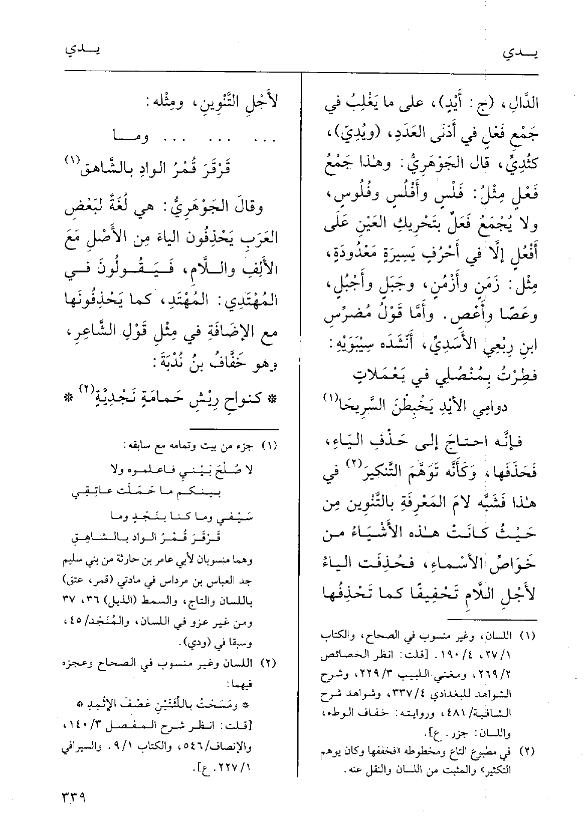 دَوامِي! الأَيْدِ يَخْبِطْنَ السَّرِيحافإنَّه احْتاجَ إِلَى حذْفِ الياءِ فحفَّفها، وكانَ يُوهم التَّكْثير فِي هَذَا فشَبَّه لامَ المَعْرفةِ بالتَّنْوينِ مِن حيثُ كانتْ هَذِه الأشْياء مِن خَواصِّ الأسْماء، فحذِفَتِ الياءُ لأجْلِ اللامِ تَخْفِيفاً كَمَا تَحْذِفُها لأَجْلِ التَّنْوينِ؛ ومِثْله: