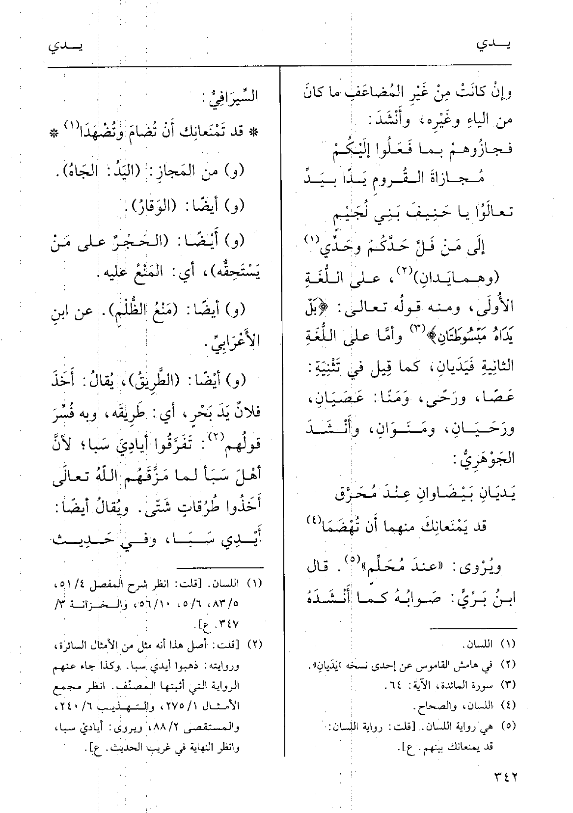 إِلَى مَنْ فَلَّ حَدَّكُمُ وحَدِّي (وهُما يَدانِ) ، على اللغَةِ الأُوْلى؛ وَمِنْه قولهُ تَعَالَى: {بل {يَداهُ مَبْسُوطَتانِ} ، وأَمَّا على اللُّغَةِ الثانيةِ} فيَدَيانِ كَمَا قيلَ فِي تَثْنيةِ عَصاً ورَحًى ومَناً عَصَيانِ ورَحَيانِ ومَنَوانِ؛ وأنْشَدَ الجَوْهرِي: