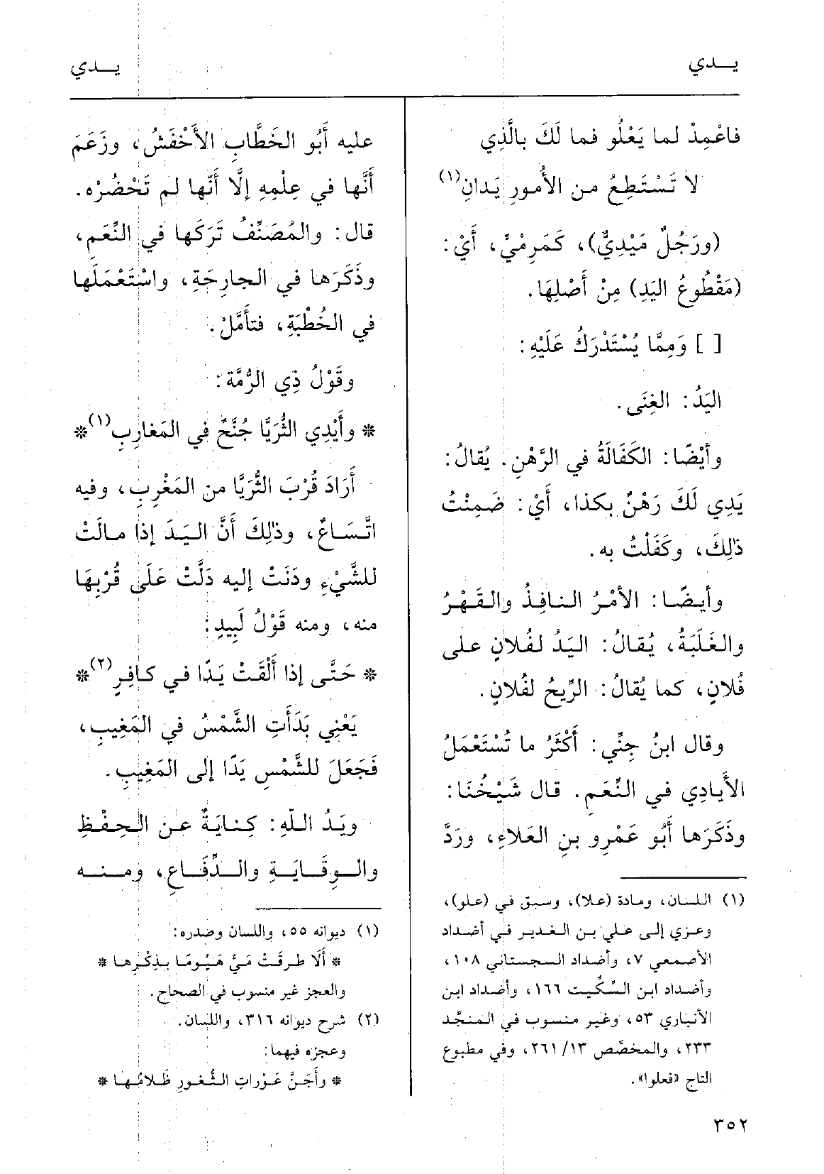 {وأَيْدِي الثُّرَيَّا جُنَّحٌ فِي المَغارِبِ أَرادَ قُرْب الثُّرَيَّا، من المَغْربِ وَفِيه اتِّسَاعٌ وذلكَ أنَّ اليَدَ إِذا مالَتْ للشَّيء ودَنَتْ إِلَيْهِ دَلَّتْ على قُرْبِها مِنْهُ؛ وَمِنْه قولُ لبيدٍ: