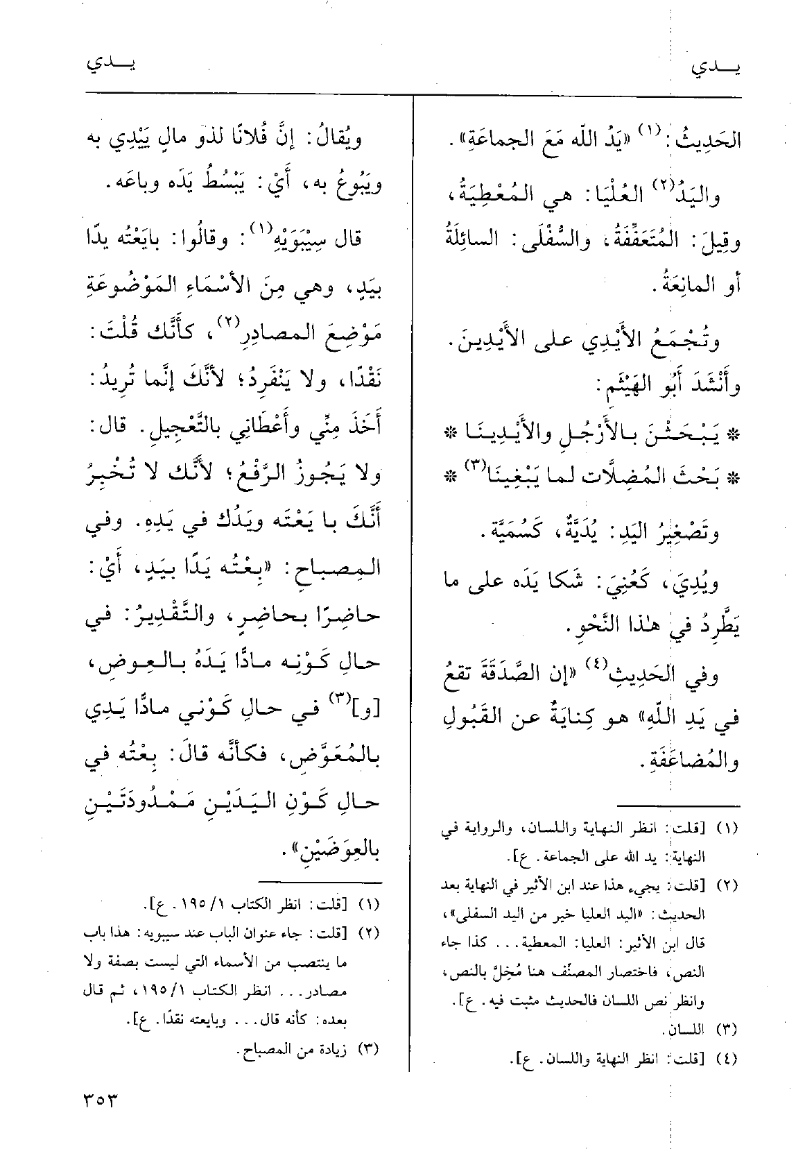الحَدِيث: ( {يَدُ اللهاِ مَعَ الجماعَةِ) ،} واليَدُ العلْيا هِيَ المُعْطِيةُ، وقيلَ: المُتَعفِّفَةُ، والسُّفْلى السَّائِلَةُ أَو المانِعَةُ.