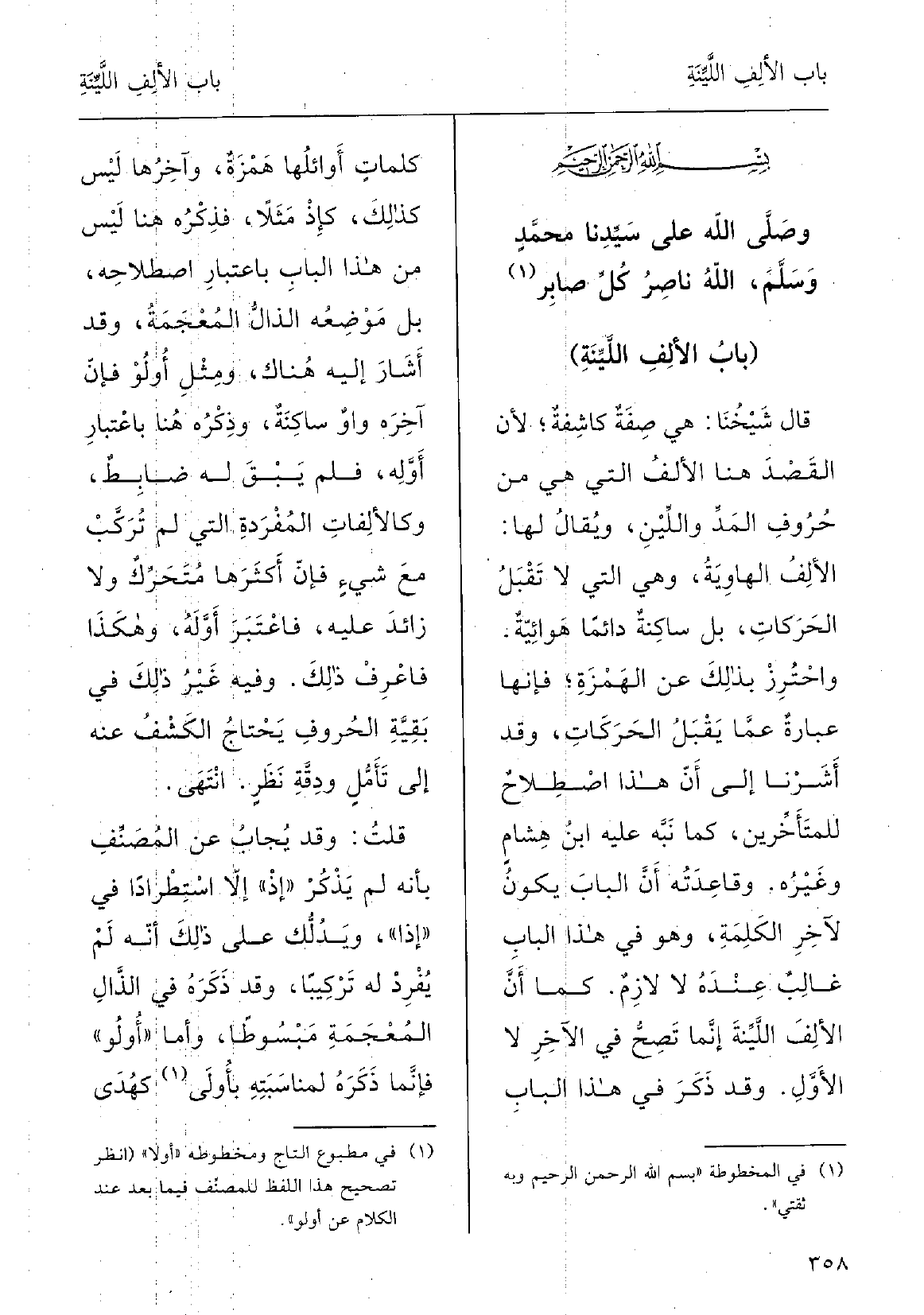 بِسم الله الرَّحْمَن الرَّحِيم وَصلى الله على سيدنَا مُحَمَّد وَسلم الله نَاصِر كل صابر (بَاب الْألف اللينة) قَالَ شيْخُنا: هِيَ صفَةٌ كاشِفَةٌ لأنَّ القَصْدَ هُنَا الألِفُ الَّتِي هِيَ مِن حُرُوفِ المدِّ واللِّين، ويقالُ لَهَا: الألِفُ الهاوِيَةُ، وَهِي الَّتِي لَا تَقْبَل الحركاتِ بل ساكِنَة دَائِما هَوائِيَّة، واحْتَرز بذلكَ عَن الهَمْزةِ فإنَّها عِبارَةٌ عَمَّا يَقْبَل الحَركاتِ وَقد أَشَرْنا إِلَى أنَّ هَذَا اصْطِلاحٌ للمُتأَخِّرين كَمَا نبَّه عَلَيْهِ ابنُ هِشام وغيرُه، وقاعِدَتُه أنَّ البابَ يكونُ لآخرِ الكَلمةِ، وَهُوَ فِي هَذَا البابِ غالِبٌ عنْدَه لَا لازِمٌ، كَمَا أنَّ الألِفَ اللَّيِّنَةَ إنَّما تصحُّ فِي الآخِرِ لَا الأوَّلِ. وَقد ذُكِرَ فِي هَذَا البابِ كلماتٌ أَوائِلُها هَمْزة وآخِرُها ليسَ كَذلكَ، كإذْ مَثَلاً فِذْكُر هُنَا ليسَ مِن هَذَا البابِ بِاعْتِبارِ اصْطِلاحِه، بل مَوْضِعه الذَّال المُعْجمة، وَقد أَشارَ إِلَيْهِ هناكَ؛ ومِثْل أولو فإنَّ آخِرَه واوٌ ساكِنَةٌ وذِكْره هُنَا باعْتِبار أَوَّله فَلم يَبْقَ لَهُ ضابِط. وكالألِفاتِ المُفْردَةِ الَّتِي لم تركبْ مَعَ شيءٍ فإنَّ أَكْثَرها مُتحرِّكٌ وَلَا زائِدَ عَلَيْهِ فاعْتُبِر أَوَّلُه، وَهَكَذَا فاعْرِف ذَلِك. وَفِيه غَيْر ذَلِك فِي بَقِيَّة الحُروفِ يَحْتاجُ الكَشْفُ عَنهُ إِلَى تأَمّل ودِقَّةً نَظَرٍ، انتَهَى.