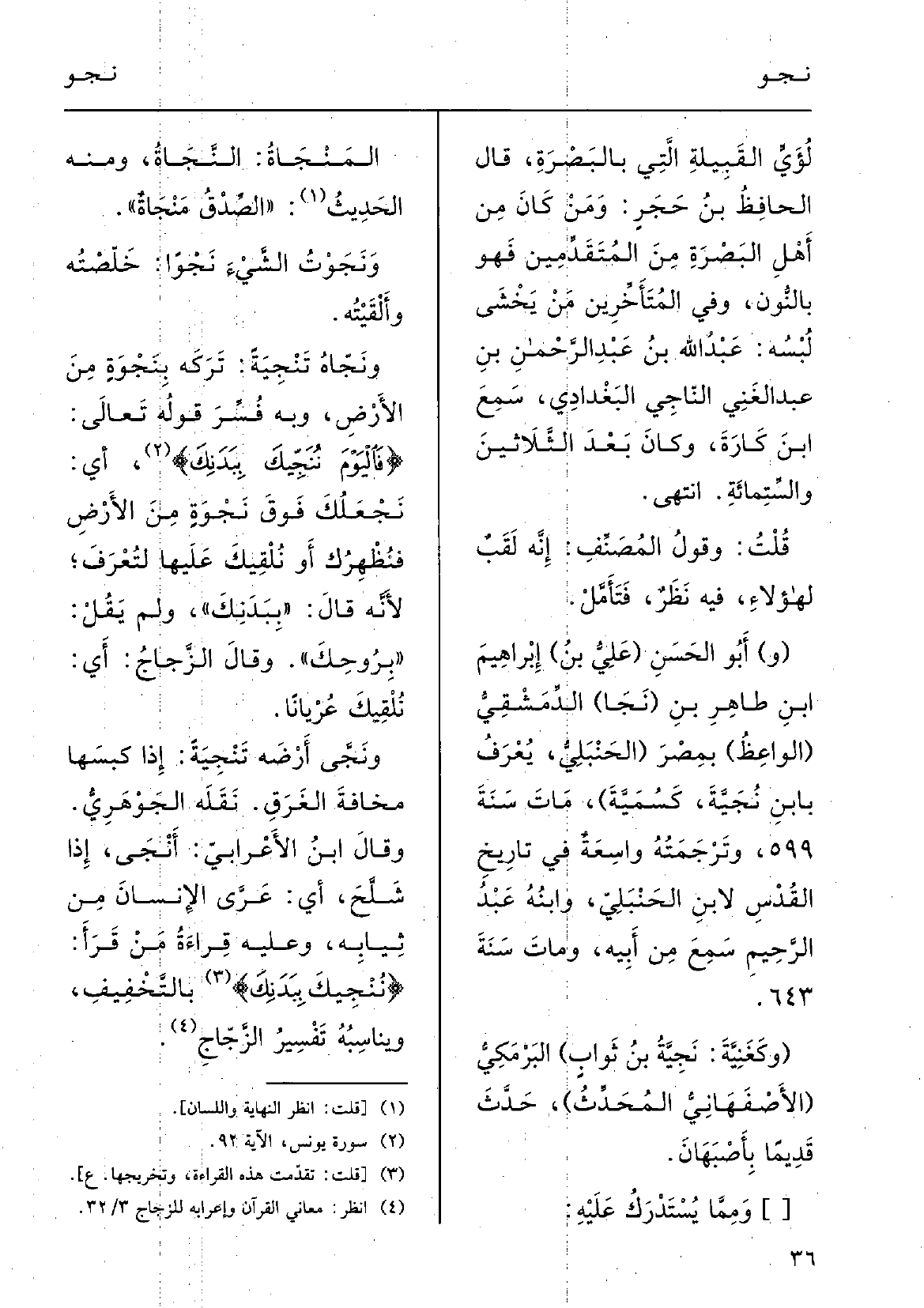 {ونَجَّاهُ} تَنْجِيَةً: تَرَكَه بنَجْوةٍ مِن الأرْضِ؛ وَبِه فُسِّر قولهُ تَعَالَى: {اليَوْم {نُنَجِّيكَ ببَدَنِكَ} ، أَي نَجْعَلَكَ فَوْقَ} نَجْوةٍ مِن الأرضِ فنُظْهِرَك أَو نُلْقِيكَ عَلَيْهَا لتُعْرَفَ، لأنَّه قالَ ببَدَنِك وَلم يَقُلْ برُوحِكَ. وَقَالَ الزجَّاج: أَي نُلْقِيكَ عُرْياناً.