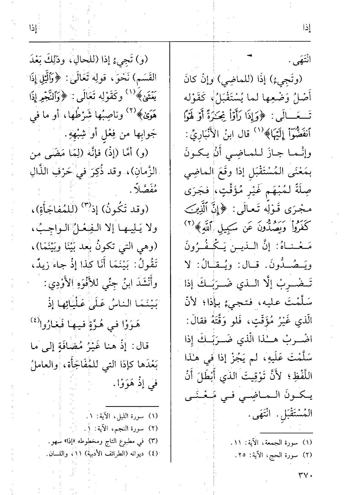 (وتَجِيءُ) إِذا (للماضِي) وَإِن كانَ أَصْلُ وَضْعِها لمَا يُسْتَقْبَل كَقَوْلِه تَعَالَى: {وَإِذا رَأَوْا تِجارَةً أَو لَهْواً انْفَضُّوا إِلَيْهَا} قَالَ ابنُ الأنْباري: وإنَّما جازَ للماضِي أَن يكونَ بمعْنَى المُسْتَقْبل إِذا وَقَعَ الماضِي صِلَة لمُبْهم غَيْر مُوَقَّت، فجَرَى مَجْرى قَوْله تَعَالَى: {إِن الَّذين كَفَروا ويَصُدُّون عَن سَبِيلِ اللهِ} ، مَعْناه إنَّ الَّذين يَكْفُرون ويَصُدّون؛ قالَ: ويقالُ: لَا تَضْرِب إِلَّا الَّذِي ضَرَبَك إِذا سَلّمْتَ عَلَيْهِ، فتَجِيءُ بإذا لأنَّ الَّذِي غَيْر مُوَقّت، فلَوْ وَقَّته فَقَالَ، اضْرِبْ هَذَا الَّذِي ضَرَبَك إذْ سلَّمْتَ عَلَيْهِ، لم يجز إِذا فِي هَذَا اللفْظِ لأنَّ توقيتَ الَّذِي أَبْطَل أَنْ يكونَ الماضِي فِي مَعْنى المْسْتَقْبل، انتَهَى.