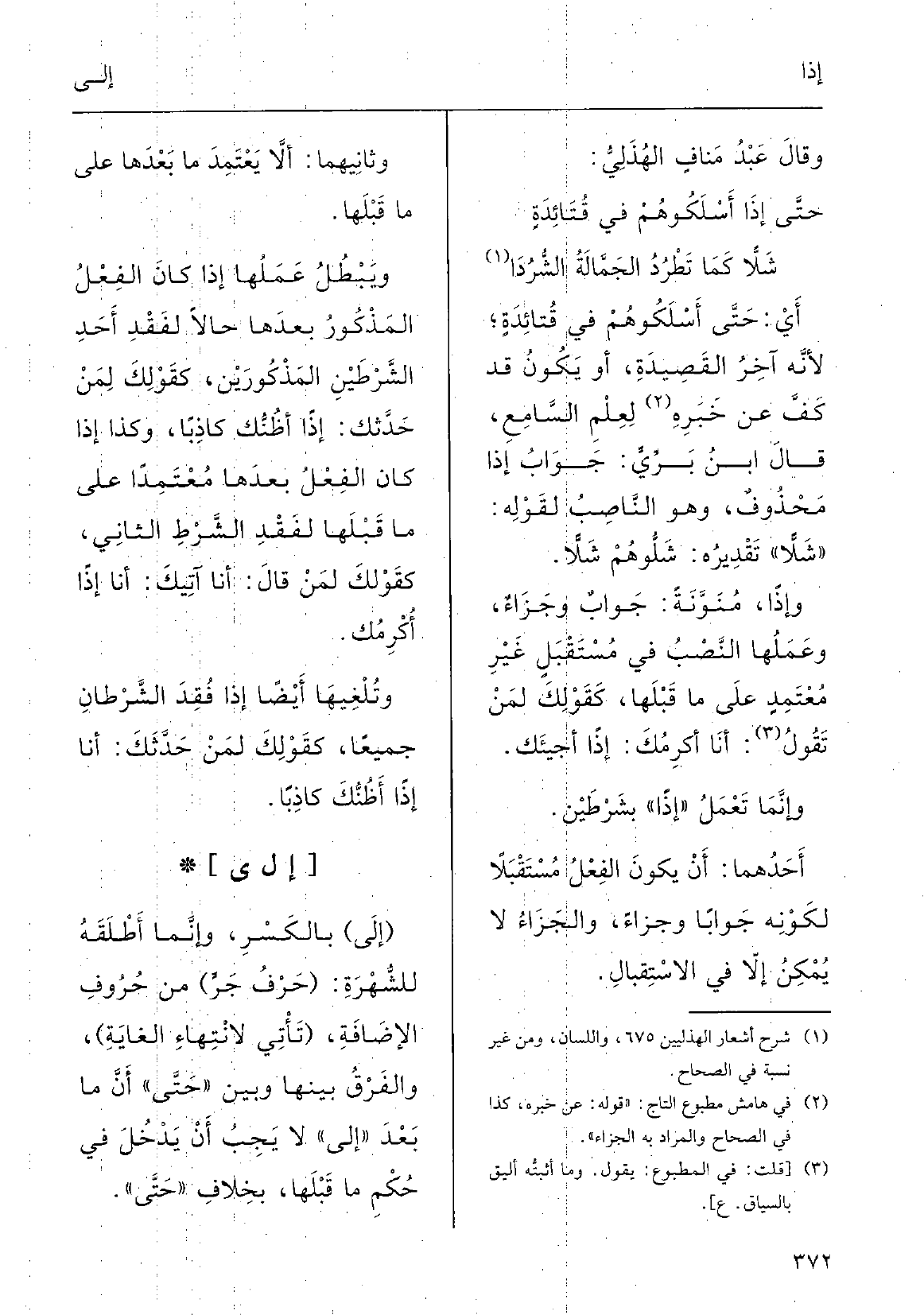 : (! إِلَى) ؛ بالكسْر، وَإِنَّمَا أَطْلَقَه للشُّهرة؛ (حَرْفُ جَرَ) مِن حُروفِ الإضافَةِ (تأْتي لانْتهاءِ الغايَةِ) ، والفَرْقُ بَيْنها وبينَ حَتَّى أَنَّ مَا بعْدَ إِلَى لَا يَجِبُ أنْ يدخلَ فِي حُكْم مَا قَبْلها بخِلافِ حَتَّى،