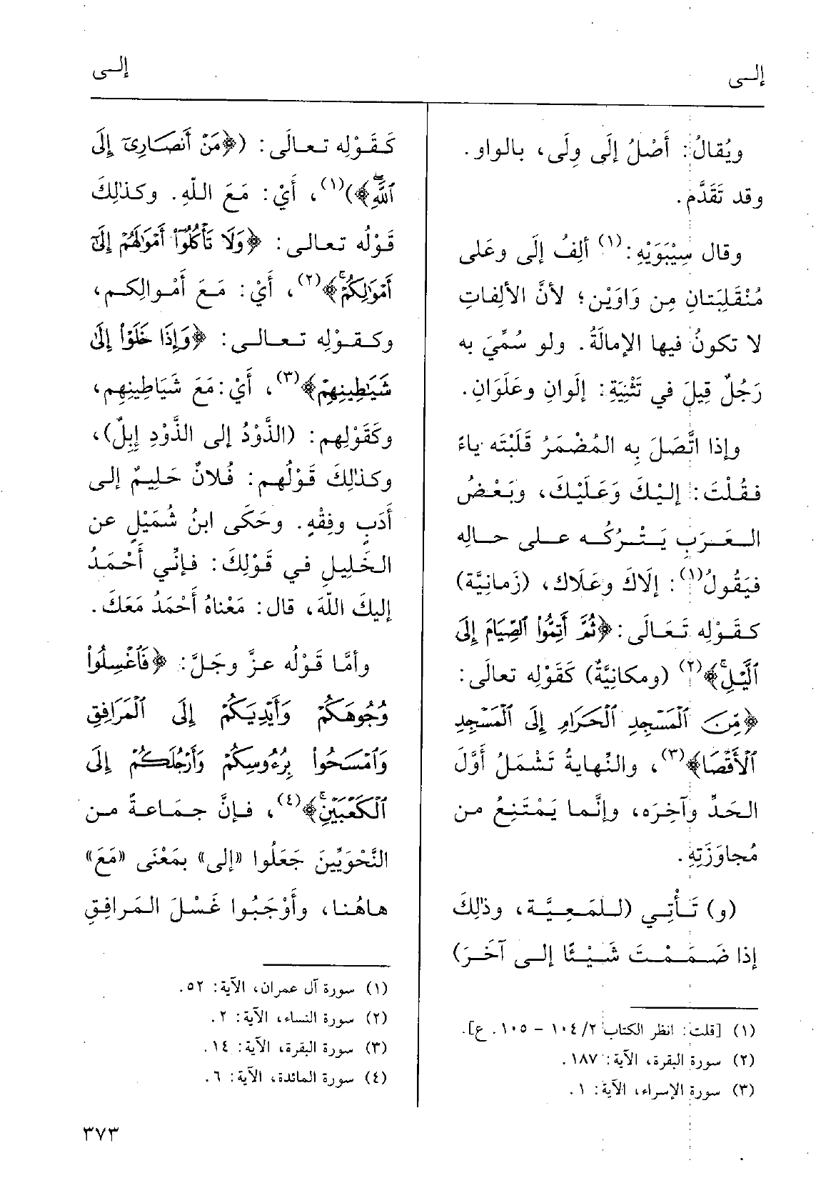 وحكَى ابنُ شُمَيْل عَن الخليلِ فِي قَوْلك: فإنّي أَحْمدُ إِلَيْك اللهاَ، قالَ: مَعْناه أَحْمدُ مَعَك؛ وأَمَّا قَوْله، عزَّ وجلَّ: {فاغْسِلُوا وُجَوهَكُم وأَيْدِيَكُم إِلَى المَرافِقِ وامْسَحُوا برُؤُوسِكم وأَرْجُلَكُم إِلَى الكَعْبَيْن} ، فإنَّ جماعَةَ مِن النَّحويِّين جَعَلوا إِلَى بمعْنَى مَعَ هَهُنَا، وأَوْجَبوا غَسْلَ المَرافِق