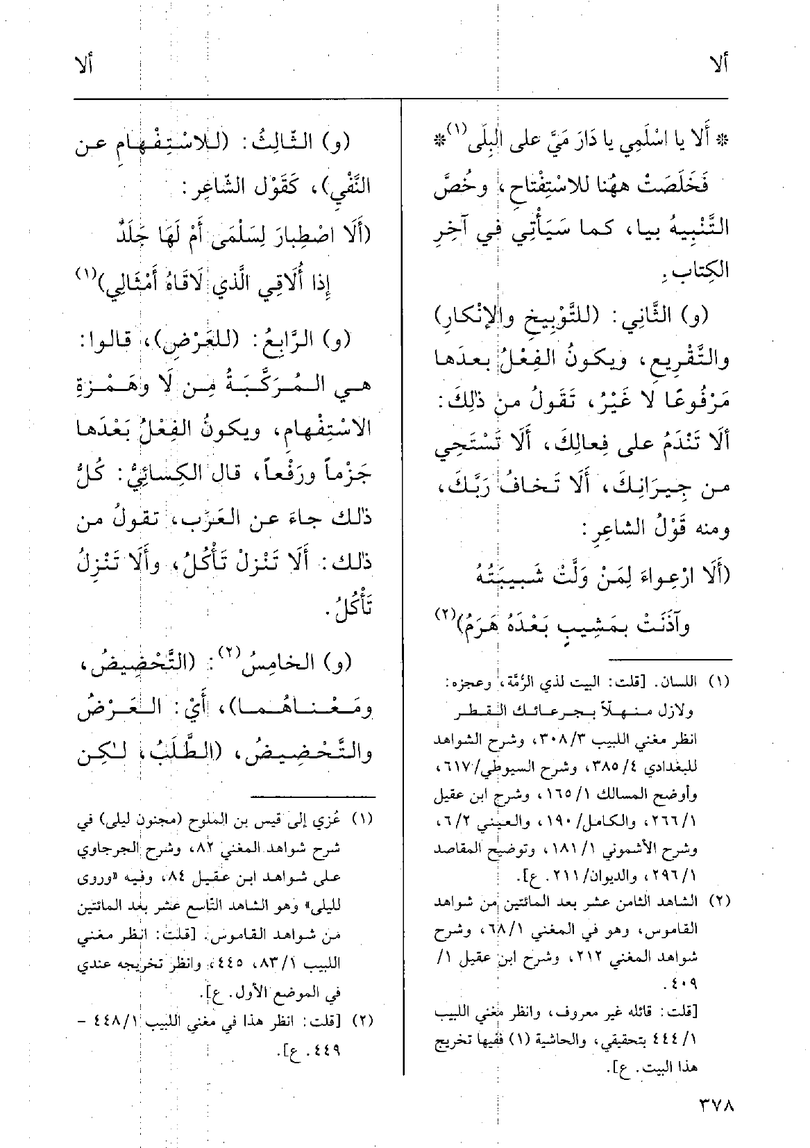 {أَلا يَا اسْلَمي يَا دارَمَيَّ على البِلى فخلَصَتْ هَهُنَا للاسْتِفْتاحِ وخُصَّ التَّنْبيهُ بيا، كَمَا سَيَأْتي فِي آخرِ الكتابِ.