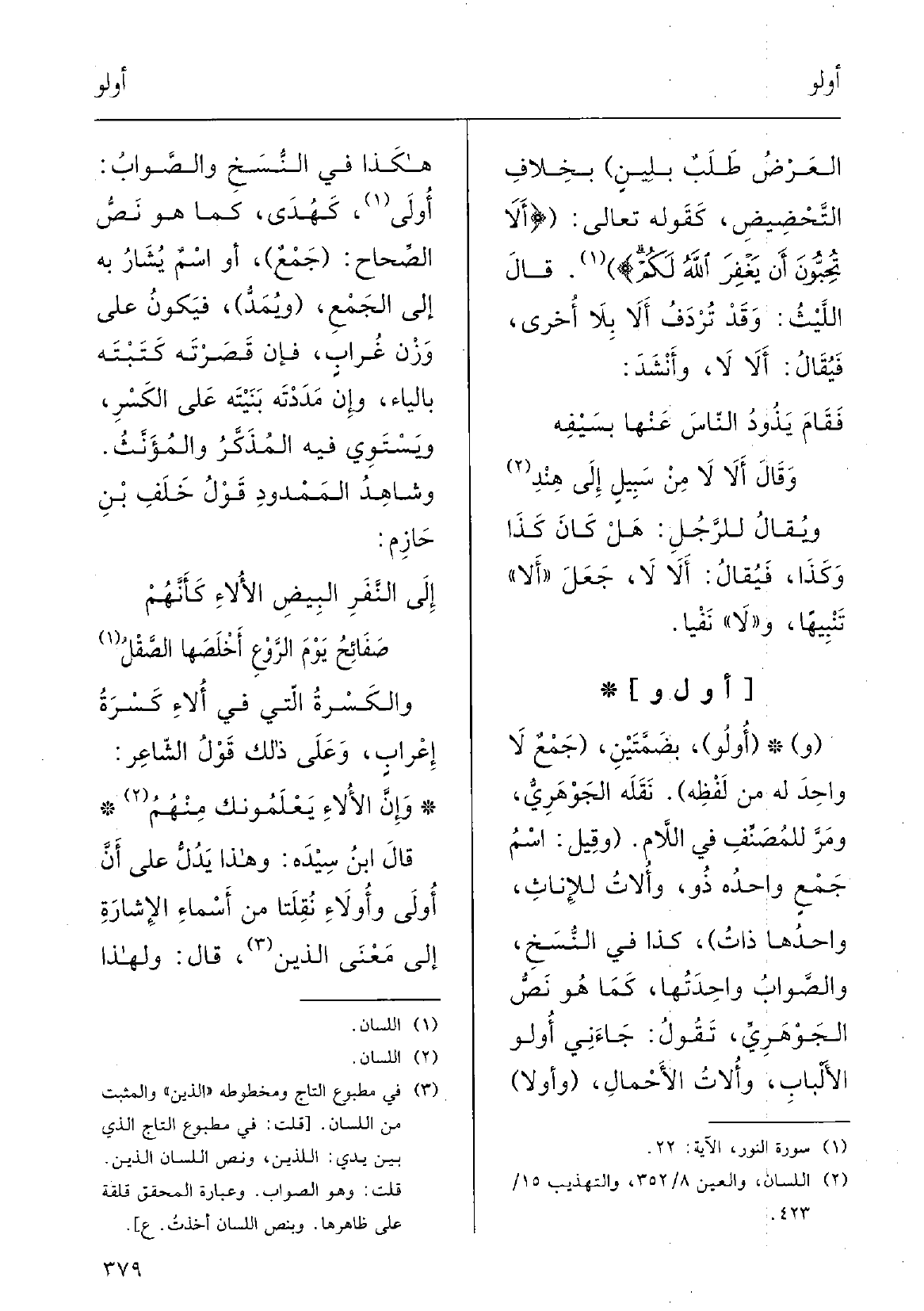 وإنَّ {الأُلاءِ يَعْلَمُونَكَ مِنْهُمُ قَالَ ابنُ سِيدَه: وَهَذَا يدلُّ على أنَّ} أُولَى! وأُولاءَ نُقِلَتا مِن أَسْماءِ الإشارَةِ إِلَى مَعْنى للَّذين، قالَ: وَلِهَذَا