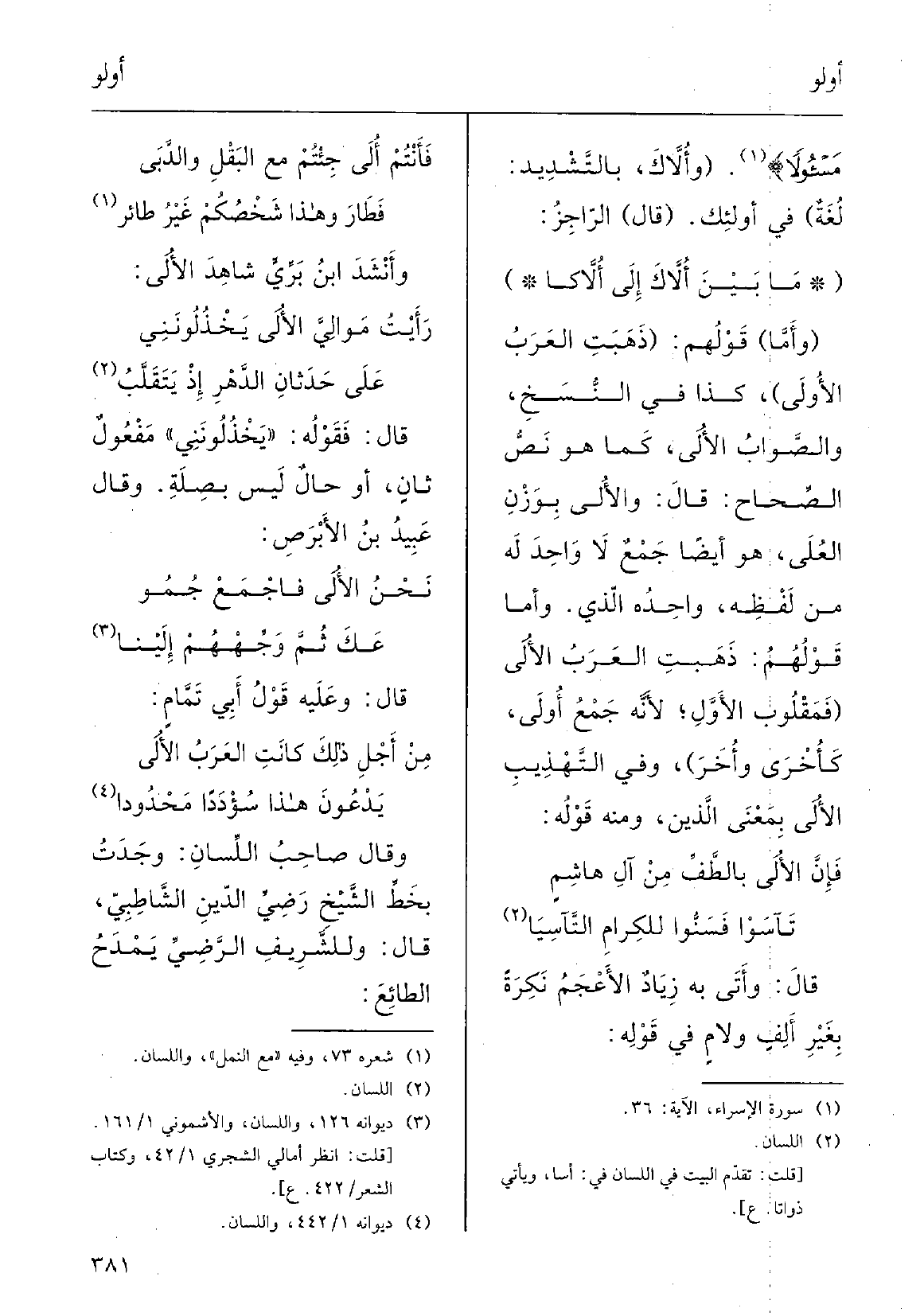 (مَا بينَ} أُلاَّكَ إِلَى {أُلاَّكَا (وأَما) قولُهم: (ذَهَبَتِ العَرَبُ} الأُولَى) ، كَذَا فِي النسخِ والصَّوابُ الأُلَى، كَمَا هُوَ نَصُّ الصِّحاح، قالَ: {والأُلَى بوَزْنِ العُلَى، هُوَ أَيْضاً جَمْعٌ لَا واحِدَ لَهُ من لَفْظِ، واحِدُه الَّذِي؛ وأَمَّا قولُهم: ذَهَبَتِ العَرَبُ الأُلَى (فَمقلوبُ الأَوَّلِ لأنَّه جَمْعُ أُولَى كأُخْرَى وأُخَرَ) .