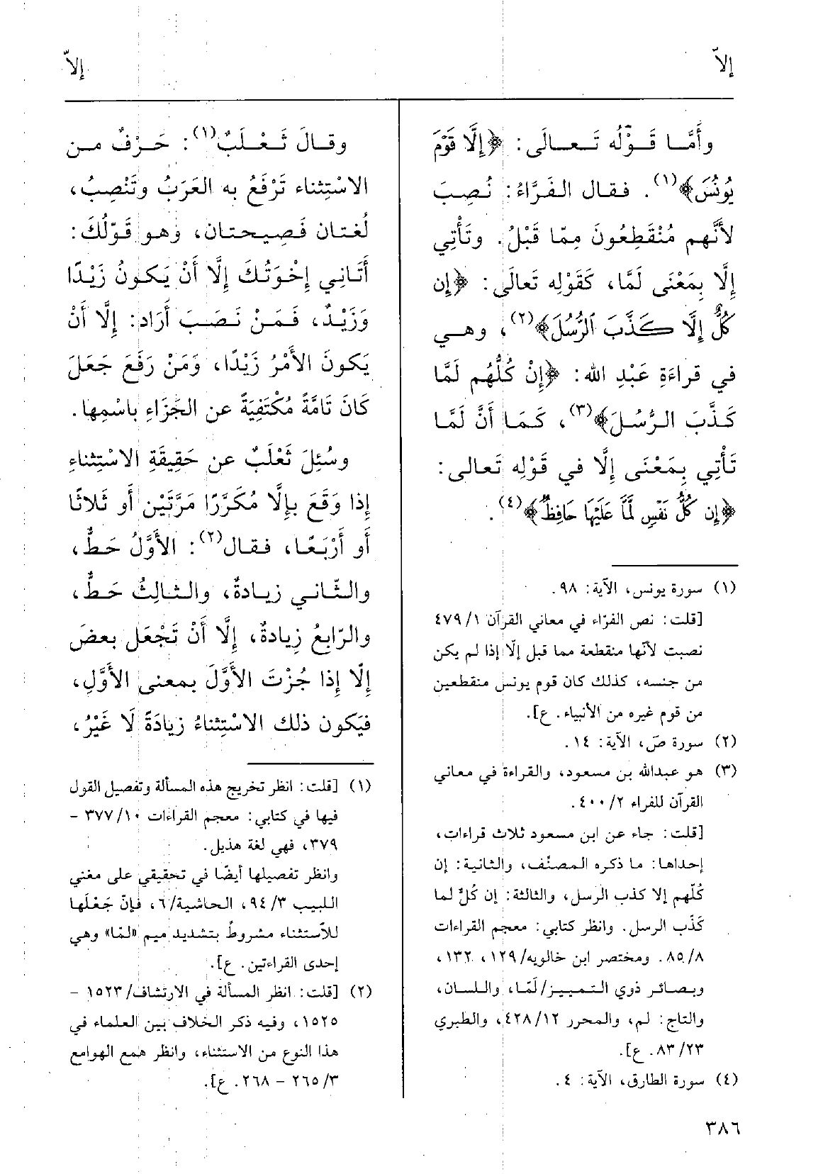 وأَمَّا قولهُ تَعَالَى: {إلاَّ قَوْمَ يُونُسَ} ؛ فقالَ الفرَّاء: نُصِب لأنَّهم مُنْقطِعُونَ ممَّا قَبْل.
