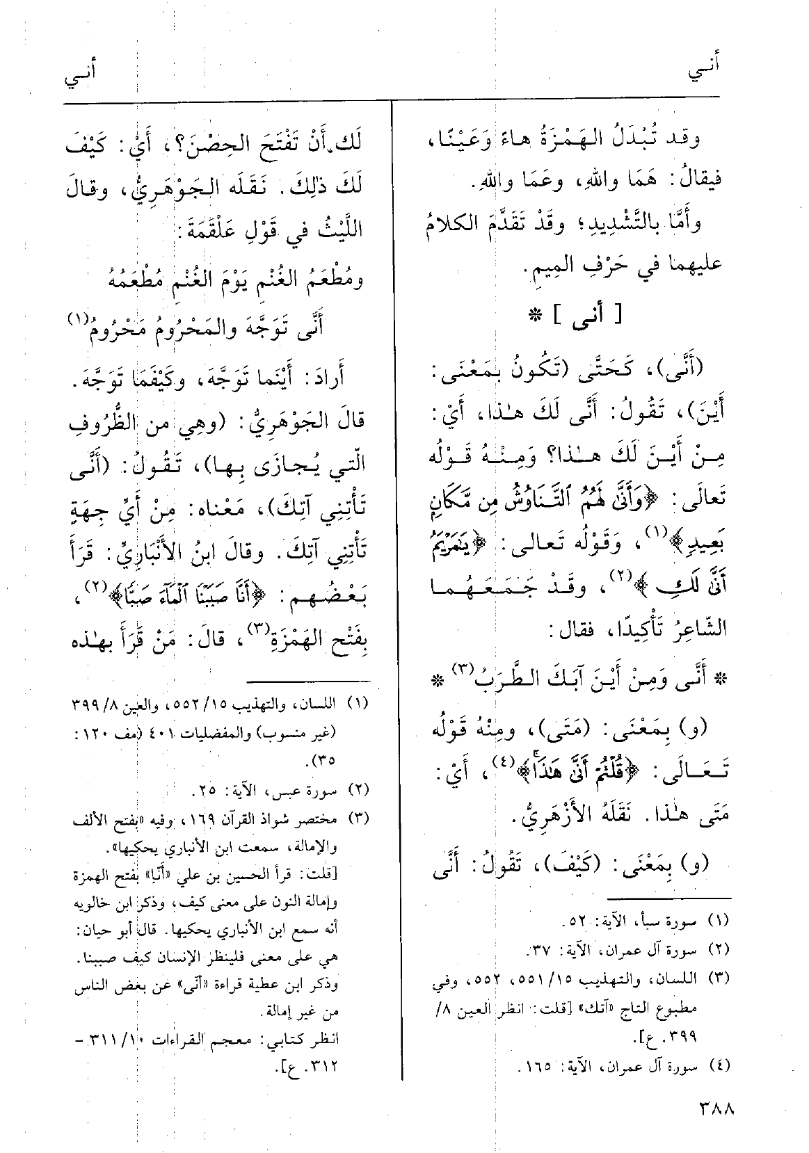 : ( {أَنَّى) ، كحَتَّى: (تكونُ بمعْنَى أيْنَ) ، تقولُ: أنَّى لكَ هَذَا، أَي مِن أَيْنَ لكَ هَذَا؛ وَمِنْه قَوْله تَعَالَى: {} وأَنَّى لَهُم التَّناوُشُ مِن مَكانٍ بَعِيدٍ} ؛ وَقَوله تَعَالَى: {يَا مَرْيَمُ أَنَّى لَكِ هَذَا} ؛ وَقد جَمَعَهُما الشاعرُ تَأْكِيدًا فَقَالَ: