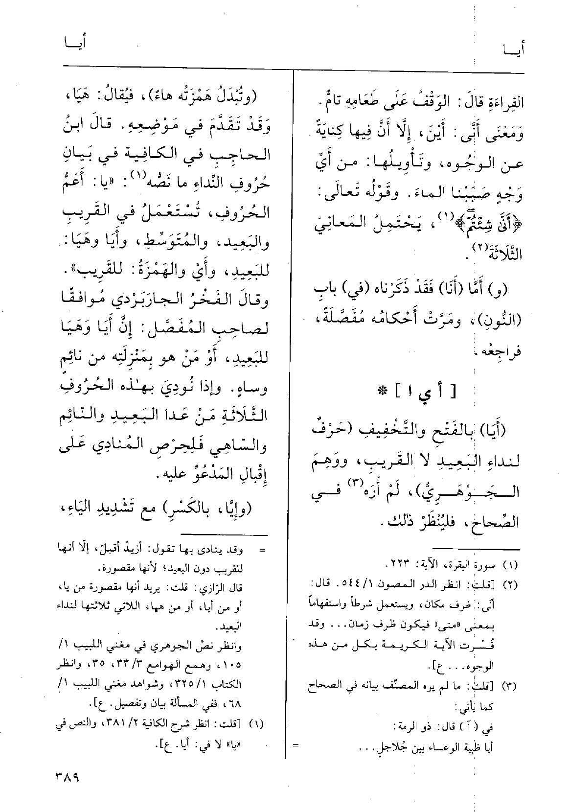 قَالَ ابنُ الحاجِبِ فِي الكفايةِ فِي بيانِ حُروفِ النِّداءِ مَا نَصّه يَا أَعَمّ الحُرُوفِ تُسْتَعْمل فِي القَرِيبِ والبَعِيدِ والمُتَوسِط،} وأَيَا وهَيَا للبَعِيدِ، واي والهَمْزةُ للقَرِيبِ.