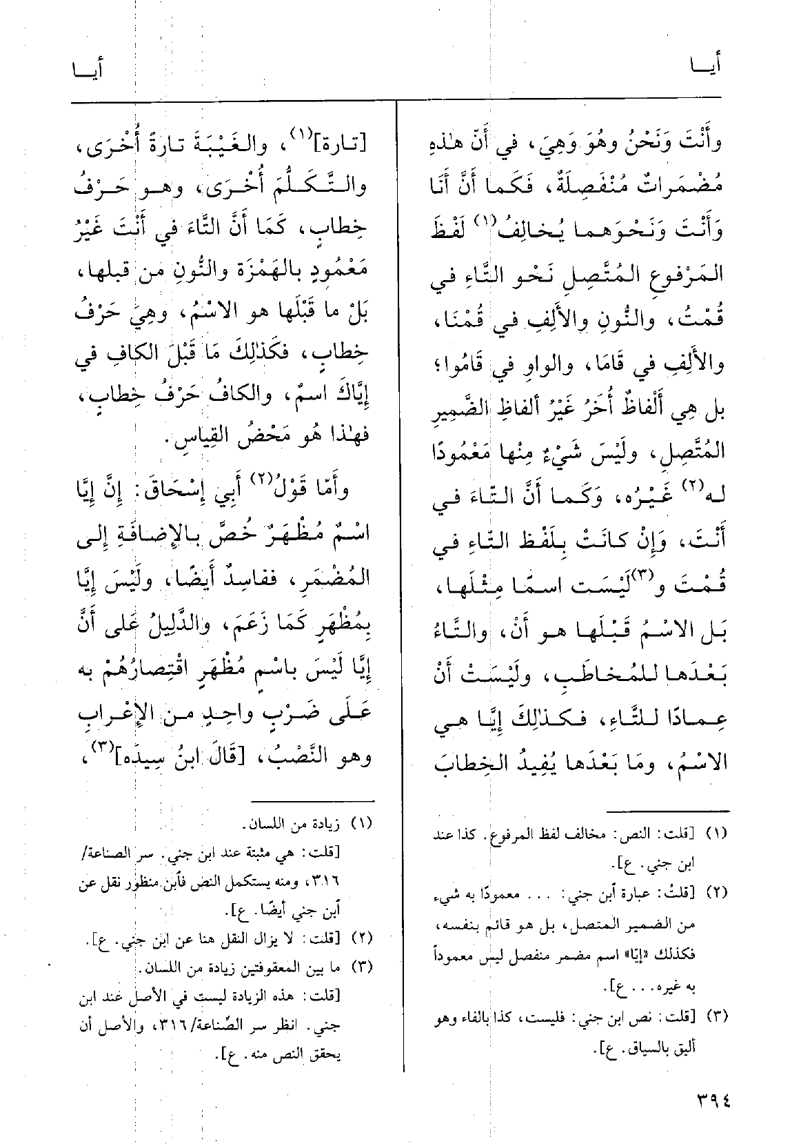 وأَنتَ ونحنُ وَهُوَ وَهِي فِي أنَّ هَذِه مُضْمَرات مُنْفصِلَة، فَكَمَا أنَّ أَنا وأَنتَ ونَحْوهما يُخالِفُ لَفْظَ المَرْفوع المُتِّصل نَحْو التَّاء فِي قُمْت والنّون والألِف فِي قُمْنا والألِف فِي قامَا وَالْوَاو فِي قامُوا، بل هِيَ أَلْفاظٌ أُخَر غَيْر أَلْفاظِ الضَّمِير المُتَّصِل، وليسَ شيءٌ مِنْهَا مَعْمودًا لَهُ غَيْرُه، وكما أنَّ التاءَ فِي أَنتَ، وَإِن كانتْ بلَفْظِ التاءِ فِي قُمْت وليسَتْ اسْماً مَثْلَها بل الاسْمُ قَبْلَها هُوَ أنْ وَالتَّاء بعْدَها للمُخاطبِ وليسَتْ أَنْ عِماداً للتاءِ، فكَذلك، إيَّا هِيَ الاسْمُ وَمَا بعْدَها يُفيدُ الخِطابَ والغيبَةَ تارَةً أُخْرى، والتَّكَلُّم أُخْرى، وَهُوَ حَرْفُ خِطابٍ كَمَا أنَّ التاءَ فِي أَنتَ غَيْر مَعْمودٍ بالهَمْزة، وَالنُّون مِن قَبْله، بل مَا قَبْلَها هُوَ الاسْمُ وَهِي حَرْفُ خِطابٍ، فكَذلكَ مَا قَبْل الكافِ فِي {إيَّاك اسْمٌ والكافُ حَرْفُ خِطابٍ، فَهَذَا هُوَ مَحْضُ القِياسِ؛ وأَمَّا قولُ أَبي إسْحق إنَّ إيَّا اسْمٌ مُظْهرٌ خُصَّ بالإضافَةِ إِلَى المُضْمر، ففاسِدٌ أَيْضاً، وليسَ إيَّا بمظْهرٍ، كَمَا زَعَمَ، والدَّليلُ على أنَّ} إيَّا ليسَ باسمٍ مظْهرٍ اقْتِصارُهم بِهِ على ضَرْبٍ واحِدٍ مِن الإعْرابِ وَهُوَ النَّصْبُ؛