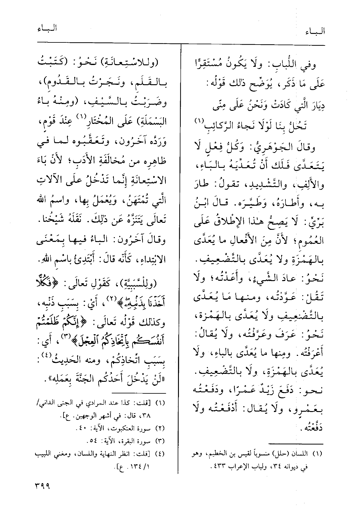 (وللسَّبَبِيَّةِ) ، كَقَوْلِه تَعَالَى: {فكُلاًّ أَخَذْنا بذَنْبهِ} ، أَي بسَبَبِ ذَنْبِهِ؛ وكَذلكَ قَوْله تَعَالَى: {إنَّكُم ظَلَمْتُم أَنْفُسَكُم باتِّخاذِكُم العِجْلَ} ، أَي بسَبَبِ اتِّخاذِكُم؛ وَمِنْه الحديثُ: (لنْ يَدْخُلَ أَحَدُكُم الجنَّةَ بعَمَلِه) .