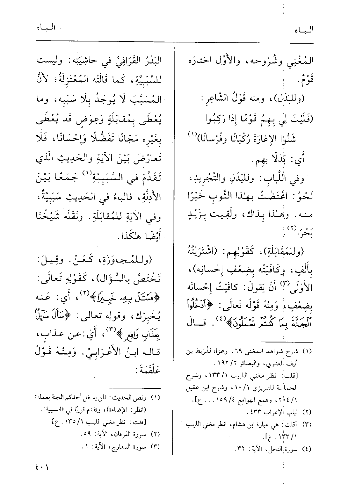 (وللمُقابَلَةِ) ، كَقَوْلِهِم: (اشْتَرَيْتُه بألْفٍ وكافَيْتُه بضِعْفِ إحْسانِه) ؛ الأَوْلى أنْ يقولَ: كافَيْتُ إحْسانَه بضِعْفٍ؛ وَمِنْه قَوْله تَعَالَى: {ادْخُلوا الجنَّة بِمَا كُنْتُم تَعْمَلُون} ؛ قالَ البَدْرُ الْقَرَافِيّ فِي حاشِيَتِه: وليسَتْ للسَّببية كَمَا قالَتْهُ المُعْتزلَةُ لأنَّ المُسَبّبَ لَا يُوجَدُ بِلا سَبَبِه، وَمَا يُعْطَى بمُقابَلَةٍ وعوضٍ قد يُعْطى بغَيْرِه مجَّانا تَفَضُّلاً وإحْساناً فَلَا تَعارض بينَ الآيَةِ والحديثِ الَّذِي تقدَّمَ فِي السَّبَبِيَّةِ جَمْعاً بينَ الأدِلَّةِ، فالباءُ فِي الحديثِ سَبَبِيَّةٌ، وَفِي الآيَةِ للمُقابَلَةِ؛ ونقلَهُ شيْخُنا أيْضاً هَكَذَا.