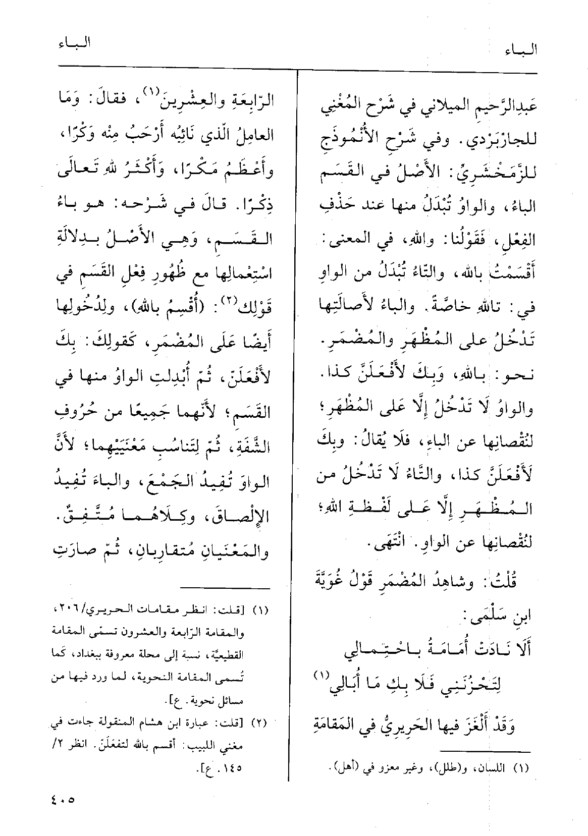 لتَحْزُنَني فَلا يَكُ مَا أُباليوقد أَلْغز فِيهَا الحرِيرِي فِي المَقامَةِ الرَّابِعَة والعِشْرِين فقالَ: وَمَا العامِلُ الَّذِي نائِبُه أَرْحَبُ مِنْهُ وكراً وأَعْظَمُ مَكْراً وأَكْثَر للهِ تَعَالَى ذِكْراً، قالَ فِي شرْحِه: هُوَ باءُ القَسَمِ، وَهِي الأصْلُ بدَلالَةِ اسْتِعْمالِها مَعَ ظُهورِ فِعْلِ القَسَمِ فِي قولِكَ: (أُقْسِمُ باللهاِ) ، ولدُخولِها أَيْضاً على المُضْمَر كقولِكَ: بكَ لأَفْعَلَنَّ، ثمَّ أُبْدِلَتِ الواوُ مِنْهَا فِي القَسَمِ لأنَّهما جَمِيعاً مِن حُروفِ الشَّفَةِ ثمَّ لتَناسُبِ مَعْنَييهما لأنَّ الواوَ تُفيدُ الجَمْع والباءُ تُفِيدُ الإلْصاقَ وكِلاهُما مُتَّفِقٌ والمَعْنيانِ مُتَقارِبانِ، ثمَّ صارَتِ الواوُ المُبْدلَة مِنْهَا أَدْوَرُ فِي الكَلام وأَعْلَق بالأقسامِ وَلِهَذَا أَلْغز بأَنَّها أَكْثَرُ لله ذِكْراً، ثمَّ إنَّ