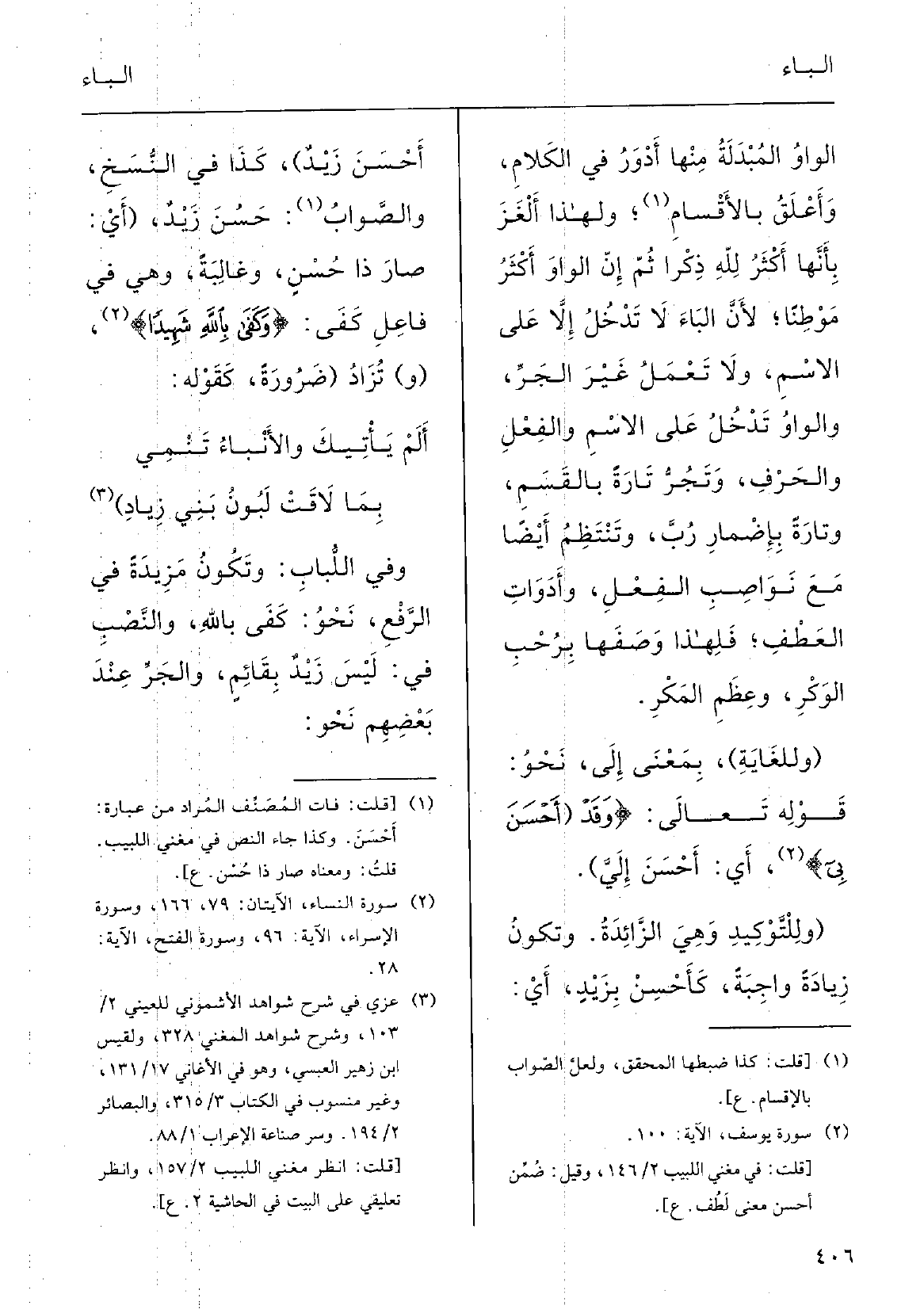 (أَلم يأْتِيكَ والأَنباءُ تَنْمِي (بِمَا لاقَتْ لَبُونُ بَني زِيادِ) وَفِي اللُّبابِ: وتكونُ مَزِيدَةً فِي الرَّفْعِ نَحْو: كَفَى باللهاِ؛ والنَّصْبِ فِي: ليسَ زَيْد بقائِم؛ والجَرِّ عنْدَ بعضِهم نَحْو: