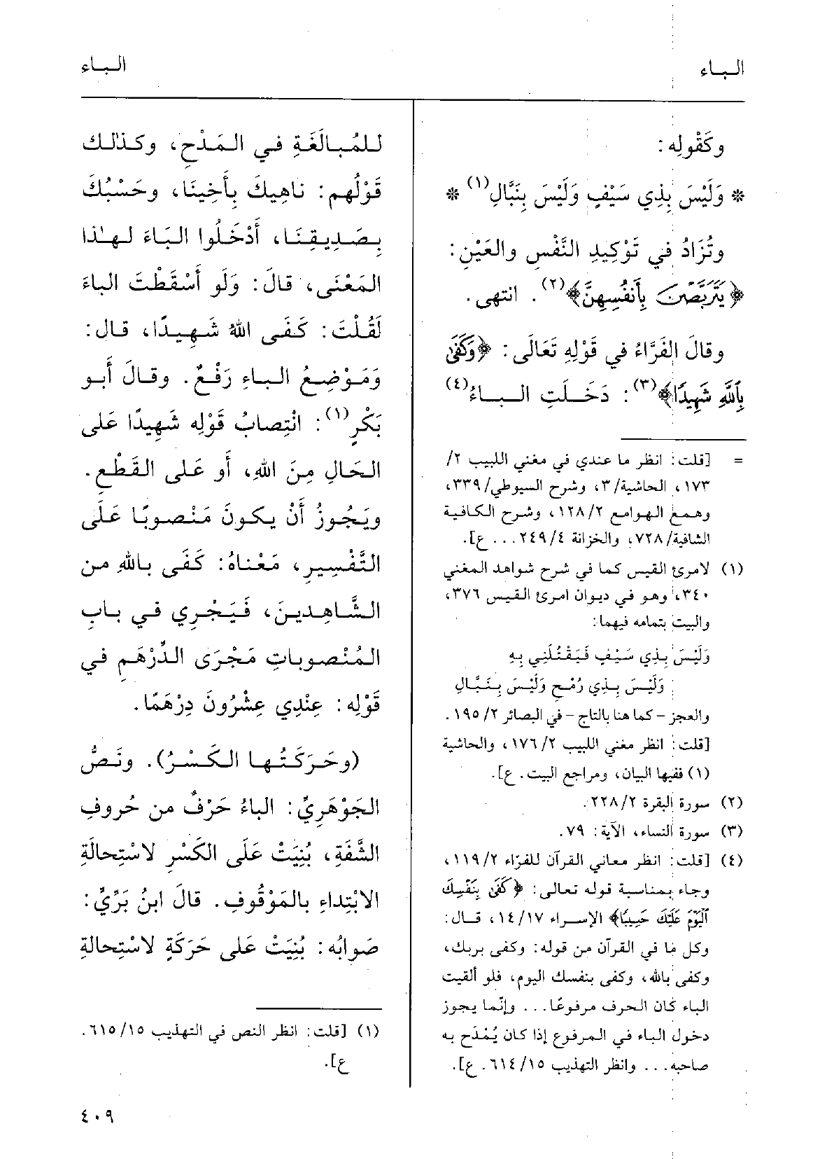وَقَالَ الفرَّاء فِي قولهِ تَعَالَى: {وكَفَى بااِ شَهِيداً} . دَخَلَتِ الْبَاء للمُبالَغَةِ فِي المَدْحِ؛ وكَذلكَ قَوْلهم: ناهِيكَ بأَخِينا؛ وحَسْبُك بصَدِيقِنا، أَدْخَلُوا الباءَ لهَذَا المَعْنى، قالَ: وَلَو أَسْقَطت الباءَ لقُلْتَ كَفَى اللهاُ شَهِيداً، قالَ: ومَوْضِعُ الباءِ رَفْعٌ؛ وَقَالَ أَبُو بكْرٍ: انْتِصابُ قولهِ شَهِيداً على الحَالِ مِن اللهاِ أَو على القَطْعِ، ويجوزُ أَن يكونَ مَنْصوباً على التَّفْسيرِ، مَعْناهُ كَفَى باللهاِ مِن الشَّاهِدين فيَجْرِي فِي بابِ المَنْصوباتِ مَجْرى الدِّرْهَم فِي قولهِ: عنْدِي عِشْرونَ دِرْهماً.