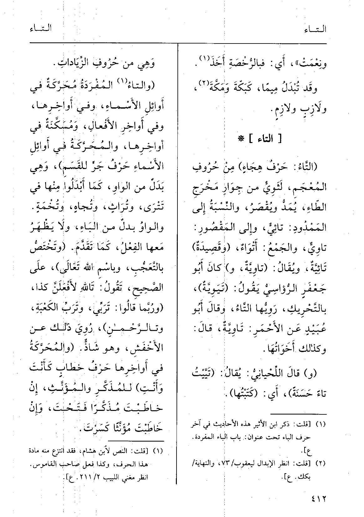 (} والتَّاءُ المُفْردَةُ محرَّكةٌ فِي أَوائِلِ الأسْماءِ، وَفِي أَواخِرِها وَفِي أَواخِرِ الأفْعالِ، ومُسَكَّنَةٌ فِي أَواخِراها. والمُحرَّكةُ فِي أَوائِلِ الأسْماءِ حَرْفٌ جّرٍ للقَسَم) ، وَهِي بدلٌ من الواوِ كَمَا أَبْدَلُوا مِنْهَا فِي تَتْرى وتُراثٍ وتُجاهٍ وتُخمَةٍ، والواوُ بدلٌ مِن الباءِ وَلَا يَظْهَرُ مَعهَا الفِعْلُ كَمَا تقدَّمَ؛ (وتَخْتَصُّ بالتَّعَجُّبِ،، وباسْمِ اللهاِ تَعَالَى) على الصَّحِيح تقولُ: اللهاِ لأَفْعَلَنَّ كَذَا؛ (ورُبَّما قَالُوا تَرَبِّي، وتَرَبِّ الكَعْبةِ، وتالرَّحْمانِ) ، رُوِي ذلكَ عَن الأَخْفَش وَهُوَ شاذٌّ (والمُحرَّكةُ فِي أَواخِرِها حَرْفُ خِطَابٍ: كأَنْتَ وأَنْتِ) للمُذَكَّرِ والمُؤَنَّثِ، إنْ خاطَبْتَ مُذكّراً فَتَحْتَ وَإِن خاطَبْتَ مُؤنَّثاً كَسَرْتَ.