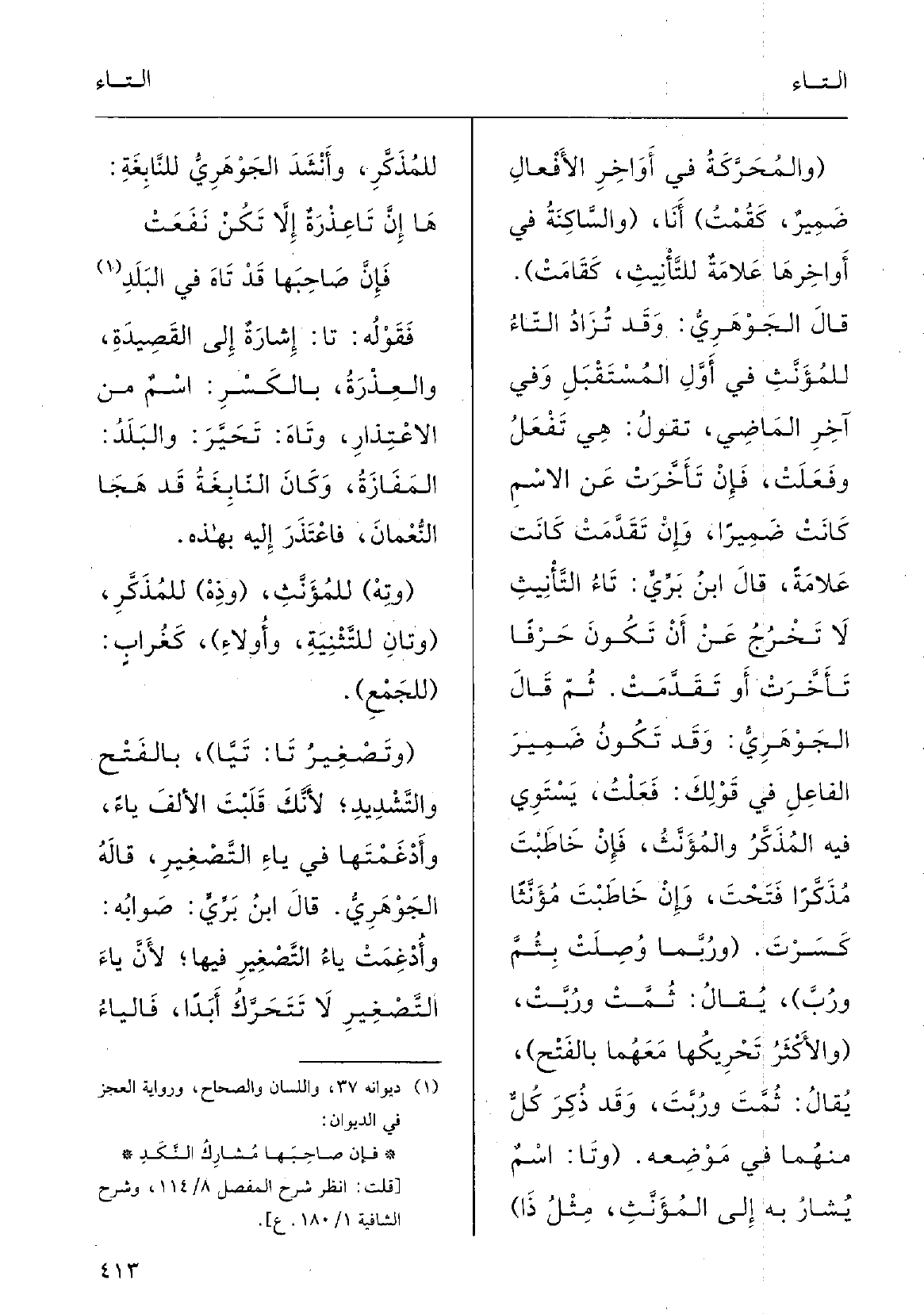 قَالَ ابنُ برِّي: تاءُ التَّأْنيثِ لَا تَخْرجُ عَن أنْ تكونَ حَرْفاً تأخَّرَتْ أَو تقدَّمَتْ.