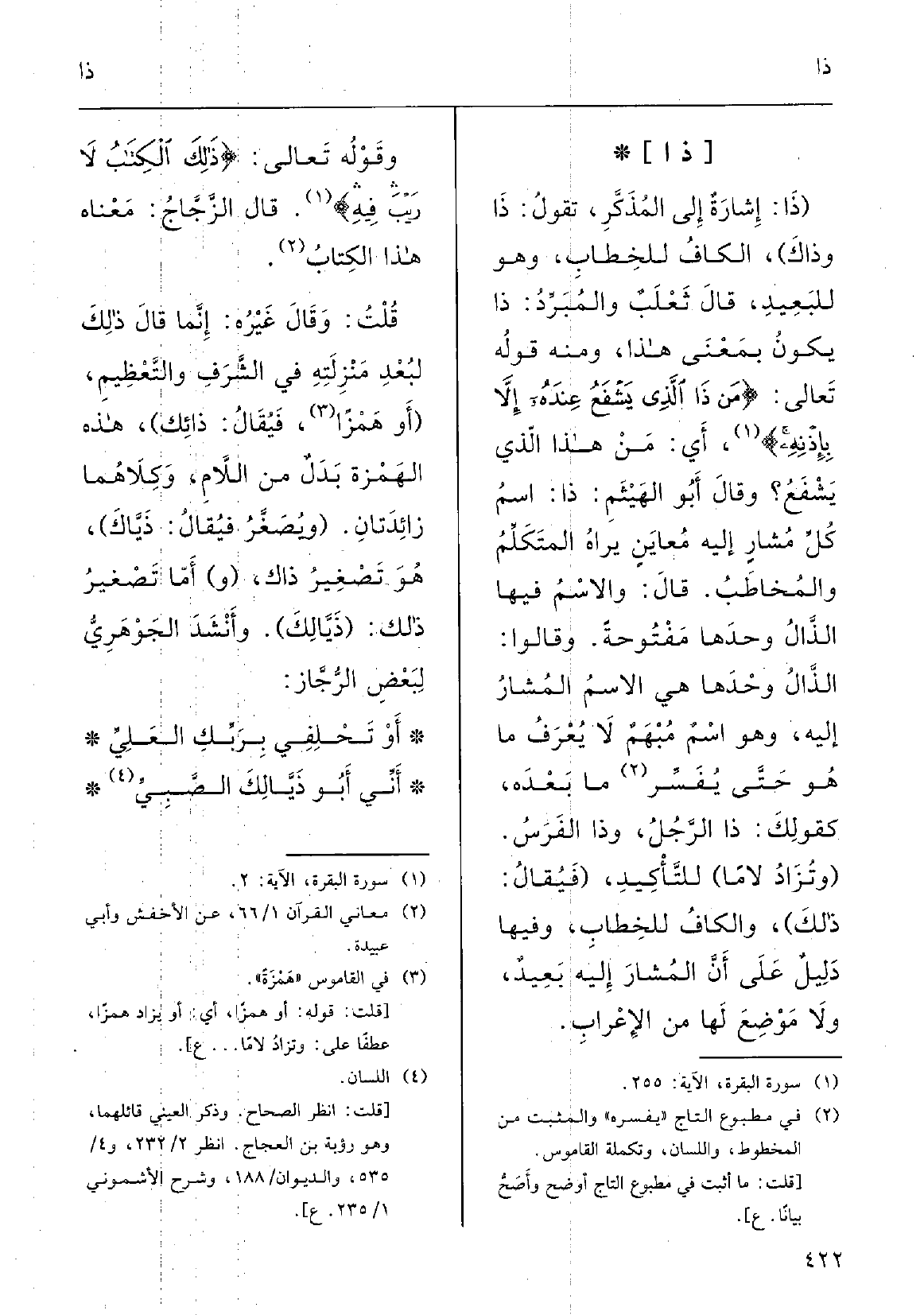 قَالَ ثَعْلبُ والمبرِّدُ: {ذَا يكونُ بمعْنَى هَذَا؛ وَمِنْه قولهُ تَعَالَى: {مَنْ ذَا الَّذِي يَشْفَعُ عنْدَه إلاَّ بإذْنِهِ} ، أَي مَنْ هَذَا الَّذِي يَشْفَع.