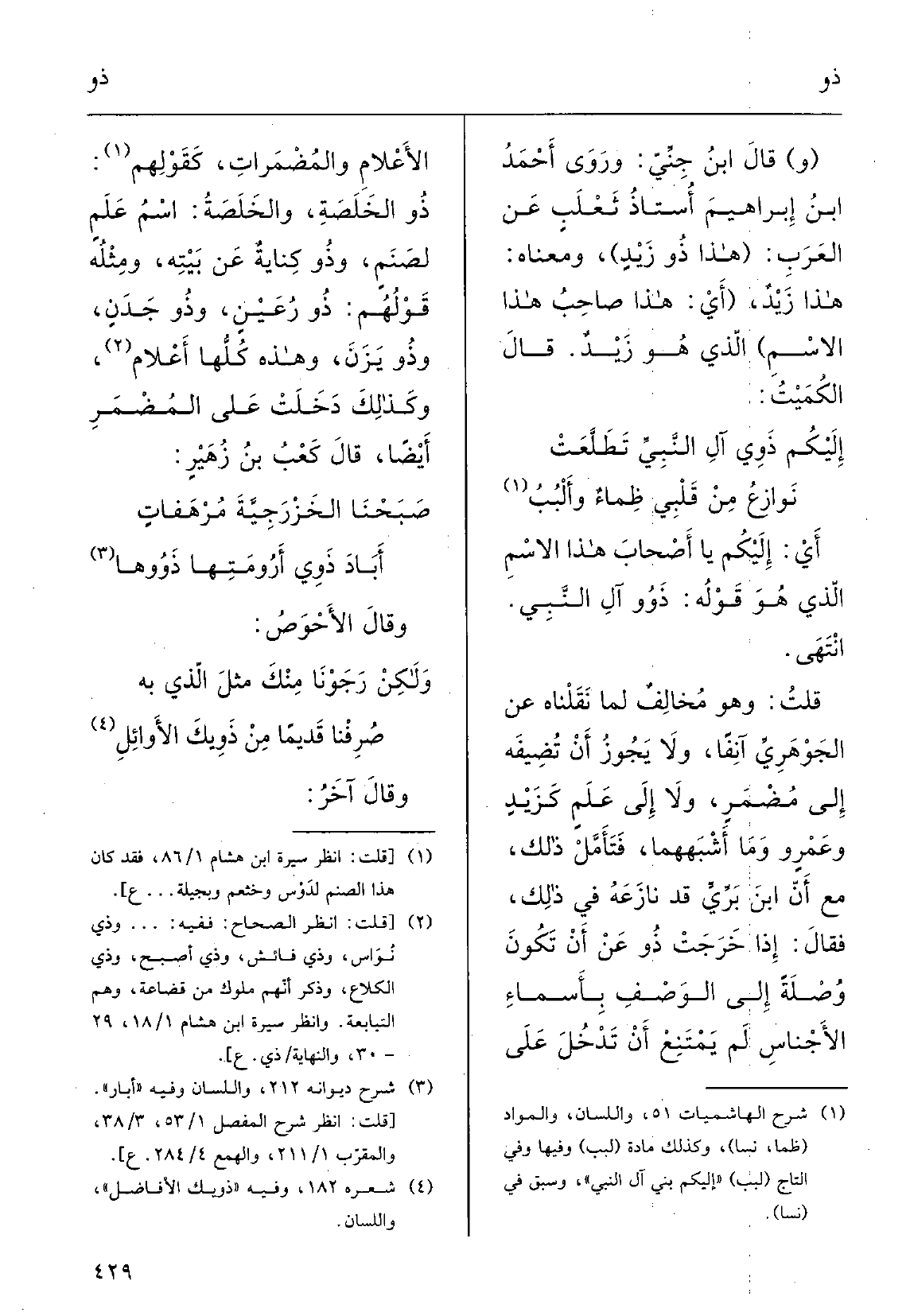 (و) قَالَ ابنُ جنِّي: ورَوَى أَحمدُ بنُ إِبْرَاهِيم أستاذُ ثَعْلب عَن العَرَبِ: (هَذَا ذُو زَيْدٍ) ، ومَعْناهُ هَذَا زَيْدٌ، (أَي هَذَا صاحِبُ هَذَا الِاسْم) الَّذِي هُوَ زَيْد، قَالَ الكُمَيْت:
