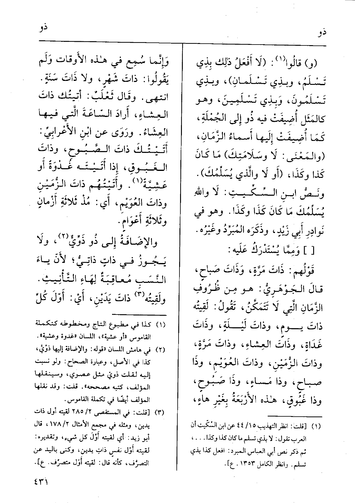 وَقَالَ ثَعْلَب: أَتَيْتُكَ ذاتَ العِشاءِ أَرادَ الساعَةَ الَّتِي فِيهَا العِشاء. ورَوَى عَن ابنِ الأَعْرابي: أَتَيْتُكَ ذاتَ الصَّبُوحِ وذاتَ الغَبُوقِ إِذا أَتَيْته غُدْوةً أَو عَشِيَّةً، وأَتَيْتهم ذاتَ الزُّمَيْنِ وذاتَ العُوَيْمِ، أَي مُذْ ثلاثَةِ أَزْمانٍ وثَلاثَة أعْوامٍ.