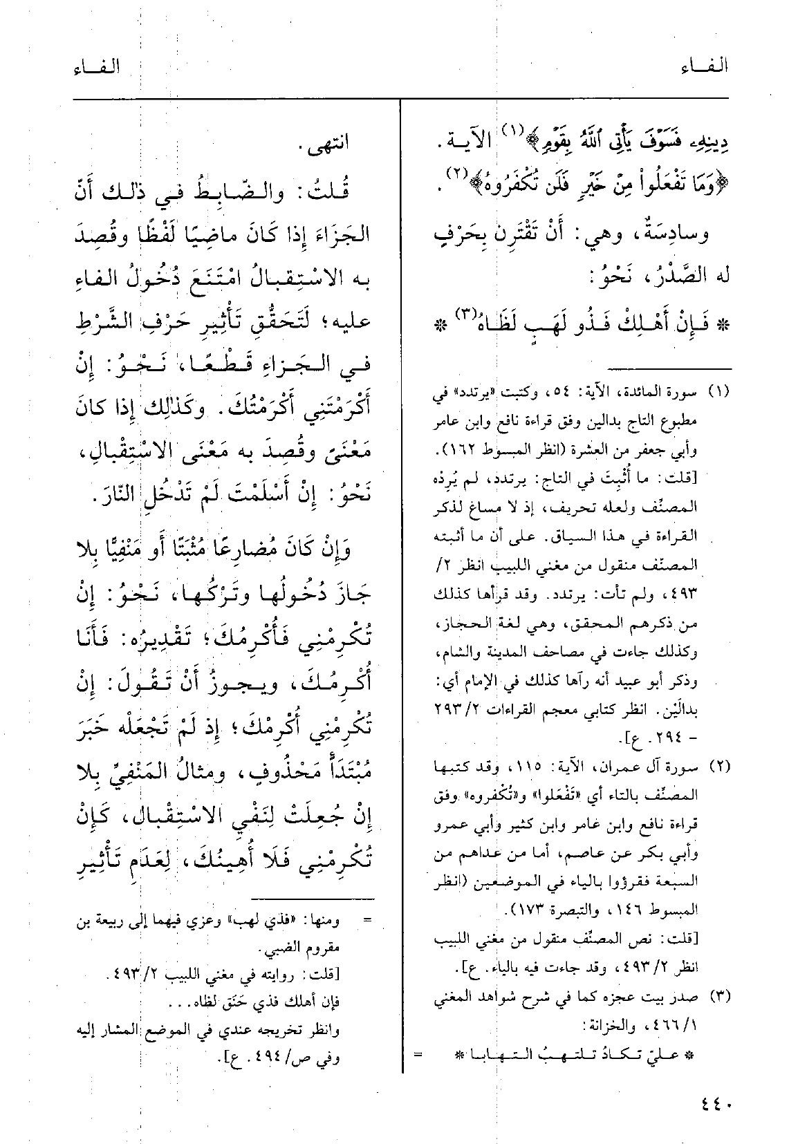 قُلْتُ: والضابِطُ فِي ذلكَ أنَّ الجَزاءَ إِذا كانَ ماضِياً لَفْظاً وقُصِدَ بِهِ الاسْتِقْبالُ امْتَنَعَ دُخولُ الفاءِ عَلَيْهِ تَحَقُّقِ تَأْثيرِ حَرْف الشَّرْط فِي الجزاءِ قَطْعاً نَحْو: إنْ أَكْرَمْتَنِي أَكْرَمْتُكَ؛ وكَذلكَ إِذا كانَ مَعْنًى وقُصِدَ بِهِ مَعْنى الاسْتِقْبالِ نَحْو: إِن أَسْلَمْتَ لم تَدْخُل النارَ؛ وَإِن كانَ مُضارِعاً مُثْبتاً أَو مَنْفِيّاً بِلا جازَ دُخولُها وتَرْكُها نَحْو: إِن تُكْرِمْني فأُكْرِمْك تَقْديرُه فأَنا أُكْرِمُك، ويجوزُ أَنْ تقولَ إنْ تُكْرِمْني أُكْرِمْك إِذْ لم تَجْعَلْه خَبَر مُبْتدأٍ مَحْذوفٍ. ومِثالُ المَنْفي بِلا إنْ جُعِلَت لنَفْي الاسْتِقْبالِ: كإنْ تُكْرِمْني فَلَا أُهِينك، لعَدَمِ تأْثِيرِ