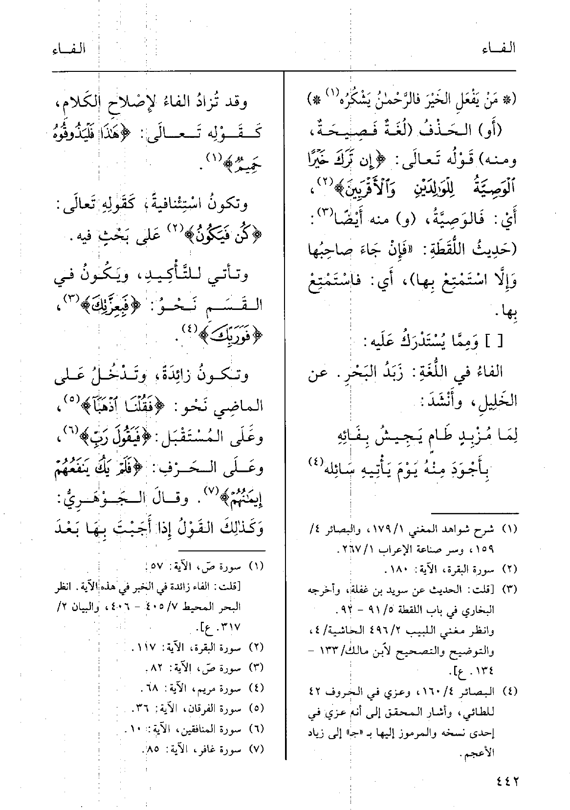 بأَجْود مِنْهُ يَوْم يأْتِيه سائِلُهوقد تُزادُ الفاءُ لإصْلاحِ الكَلامِ كَقَوْلِه تَعَالَى: {هَذَا فليَذُوقُوه حَمِيم} .