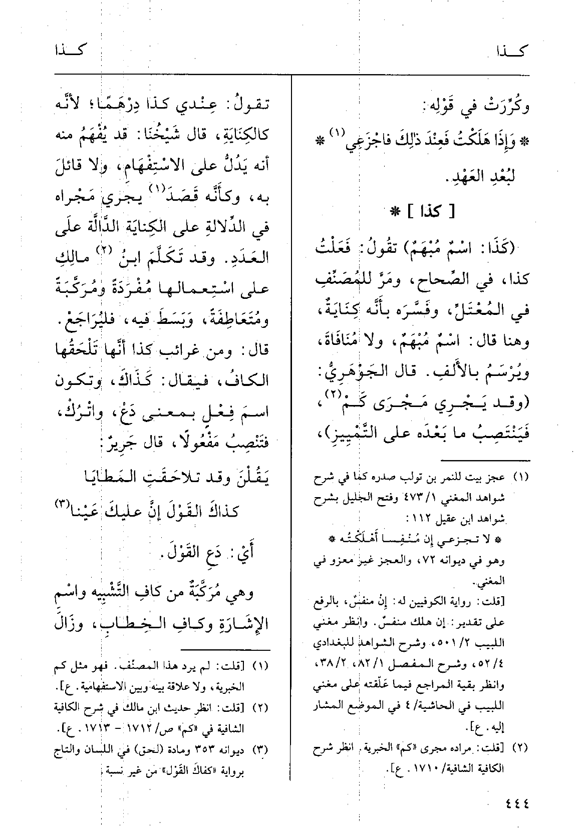 } كذاكَ القَوْل إنَّ عَلَيْك عَيْناأَي دَعِ القَوْل، وَهِي مُرَكَّبَةٌ مِن كافِ التّشْبيهِ واسْمِ الإشارَةِ وكافِ الخِطابِ، وزَالَ