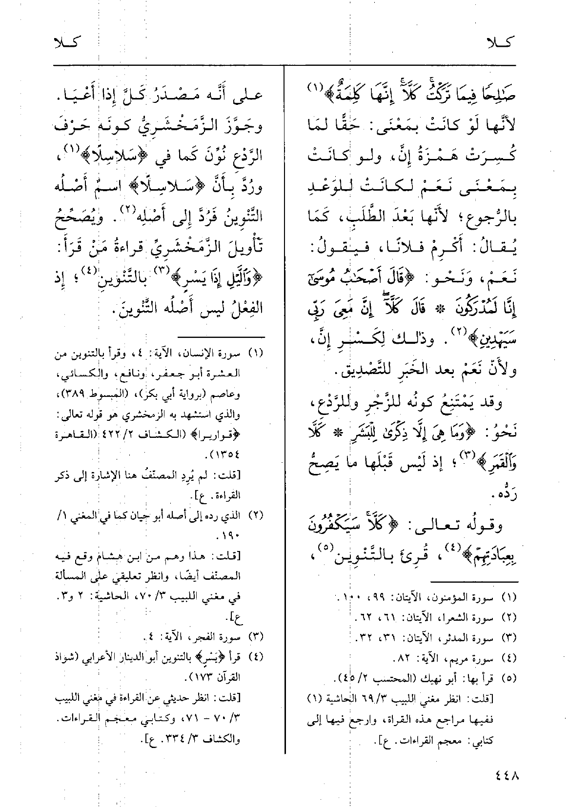 صَالحا فِيمَا تَرَكْت كَلاَّ إنَّها كَلِمةُ} لأنَّها لَو كانتْ بمعْنَى حَقًّا لمَا كُسِرَتْ هَمْزةُ إنّ؛ وَلَو كانتْ بمعْنَى نَعَم لكانَتْ للوَعْد بالرّجُوعِ لأنّها بعْدَ الطَّلَب كَمَا يقالُ: اكرم فلَانا فيقولُ نَعَم؛ ونحوَ: {قالَ أَصْحابُ مُوسَى إنَّا لمُدْرَكُون، قَالَ: كَلاَّ إنَّ مَعي رَبِّي سَيَهْدِينِ} وذلكَ لكَسْر إِن، ولأنَّ نَعْم بعْدَ الخَبَر للتَّصْدِيقِ، وَقد يَمْتنعُ كَوْنها للزَّجْرِ وللرَّدْعِ نَحْو: {وَمَا هِيَ إلاَّ ذِكّرى للبَشَر كَلاَّ والقَمَر} ، إِذْ ليسَ قَبْلَها مَا يصحُّ رَدّه؛ وَقَوله تَعَالَى: {كَلاَّ سَيَكْفرُونَ بعِبادَتِهم} قُرىءَ بالتّنْوين على أنَّه مَصْدرُ كَلَّ إِذا أَعْيَا، وجَوَّزَ الزَّمَخْشري كَوْنَه حَرْف الرَّدْع نونِّ كَمَا فِي {سلاسلاً} ورَدَّ بأَنَّ سلاسلا اسْمٌ أَصْلُه التَّنْوين فَردَّ إِلَى أَصْلِه، ويُصَحِّح تأْوِيل الزَّمَخْشري قِراءَة مَنْ قَرَأَ {واللّيْل إِذا يسر} ، بالتَّنْوين، إِذا الفِعْل ليسَ أَصْلُه التَّنْوين.
