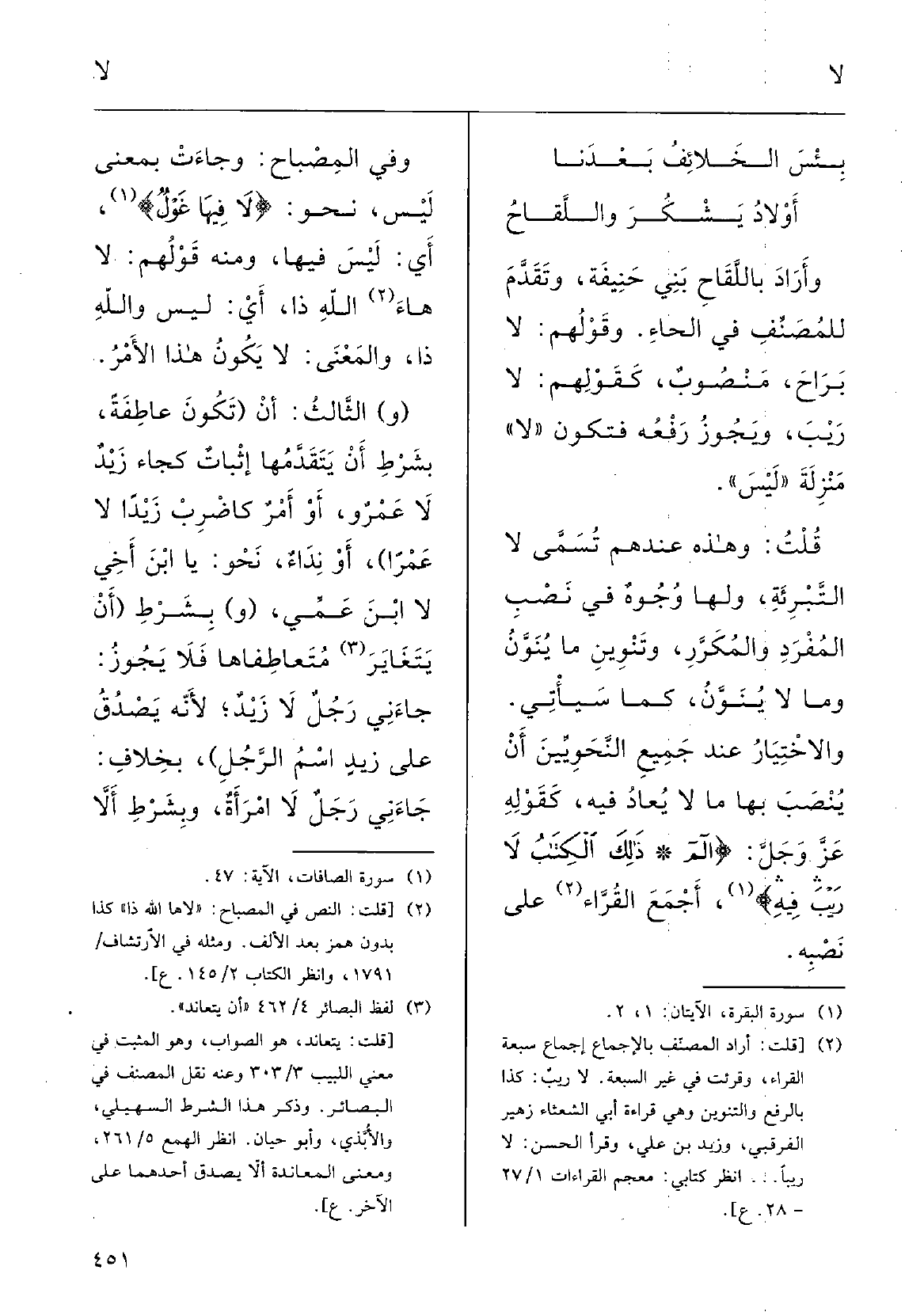 قُلْتُ: وَهَذِه عِنْدَهم تُسَمَّى لَا التَّبْرِئةِ، وَلها وُجُوهٌ فِي نَصْبِ الْمُفْرد والمُبكَرَّ وتَنْوِين مَا يُنَوَّن وَمَا لَا يُنَوَّن كَمَا سَيَأتي؛ والاخْتِيارُ عنْدَ جمِيعِ النّحويِّين أَن يُنْصَبَ بهَا مَا لَا يُعادُ فِيهِ كَقَوْلِه، عزَّ وجلَّ: {ألم، ذلكَ الكِتابُ لَا رَيْبَ فِيهِ} ، أَجْمع القُراءُ على نَصْبِه.