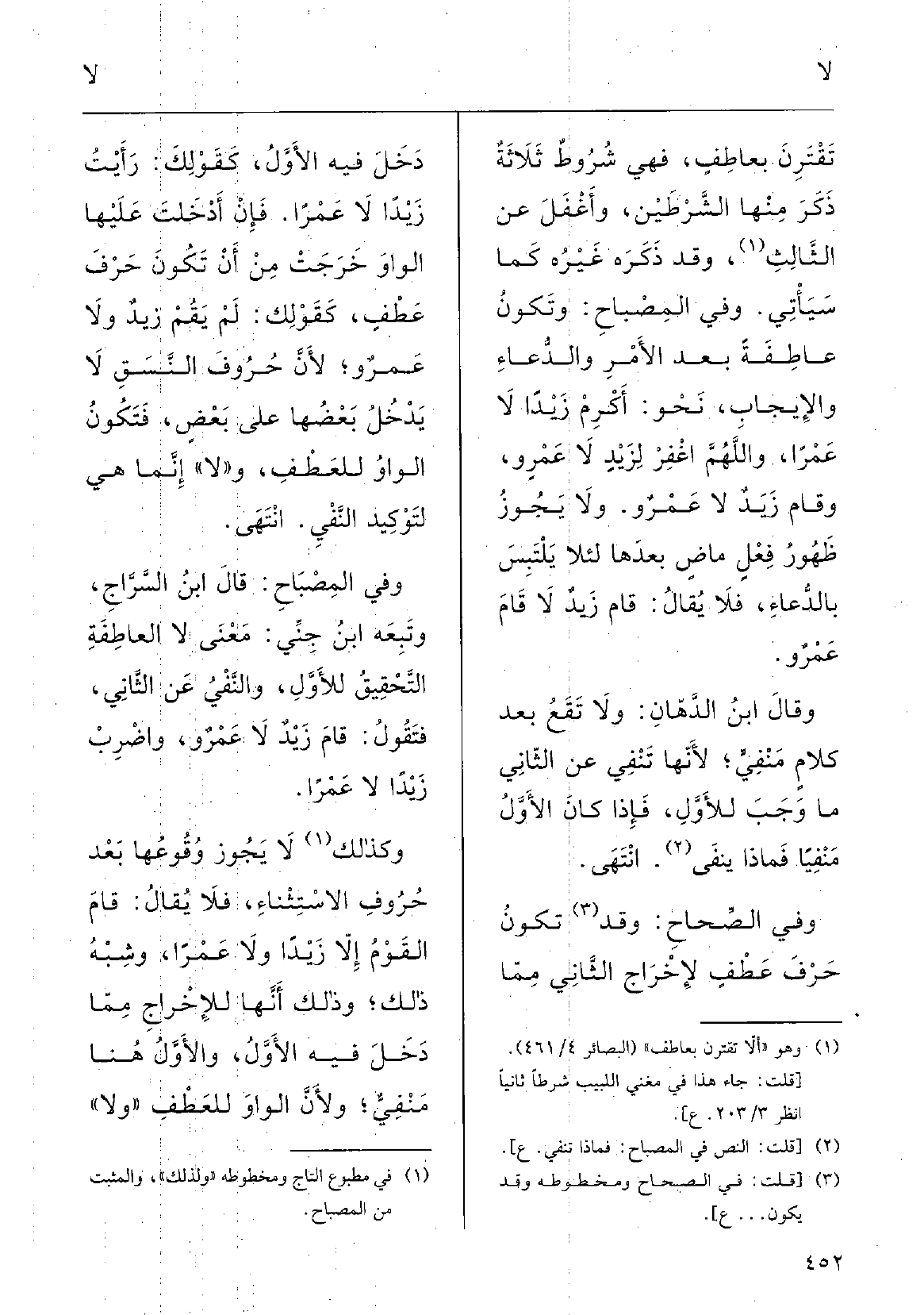 وَفِي المِصْباح: قَالَ ابنُ السَّراج وتَبِعَه ابنُ جنِّي: مَعْنى لَا العاطِفَة التَّحْقيق للأَوّل والنَّفْي عَن الثَّانِي فتقولُ قامَ زَيْدٌ لَا عَمْرو، واضْرِبْ زَيْداً لَا عَمْراً، ولذلكَ لَا يجوزُ وُقُوعُها بعْدَ حُروفِ الاسْتِثْناءِ فَلَا يقالُ قامَ القَوْمُ إلاَّ زَيْداً وَلَا عَمْراً، وشبْه ذلكَ، وذلكَ أَنَّها للإخْراجِ مماَّ دَخَلَ فِيهِ الأوَّل، والأوّل هُنَا مَنْفيٌّ، ولأنَّ الواوَ للعَطْفِ وَلَا