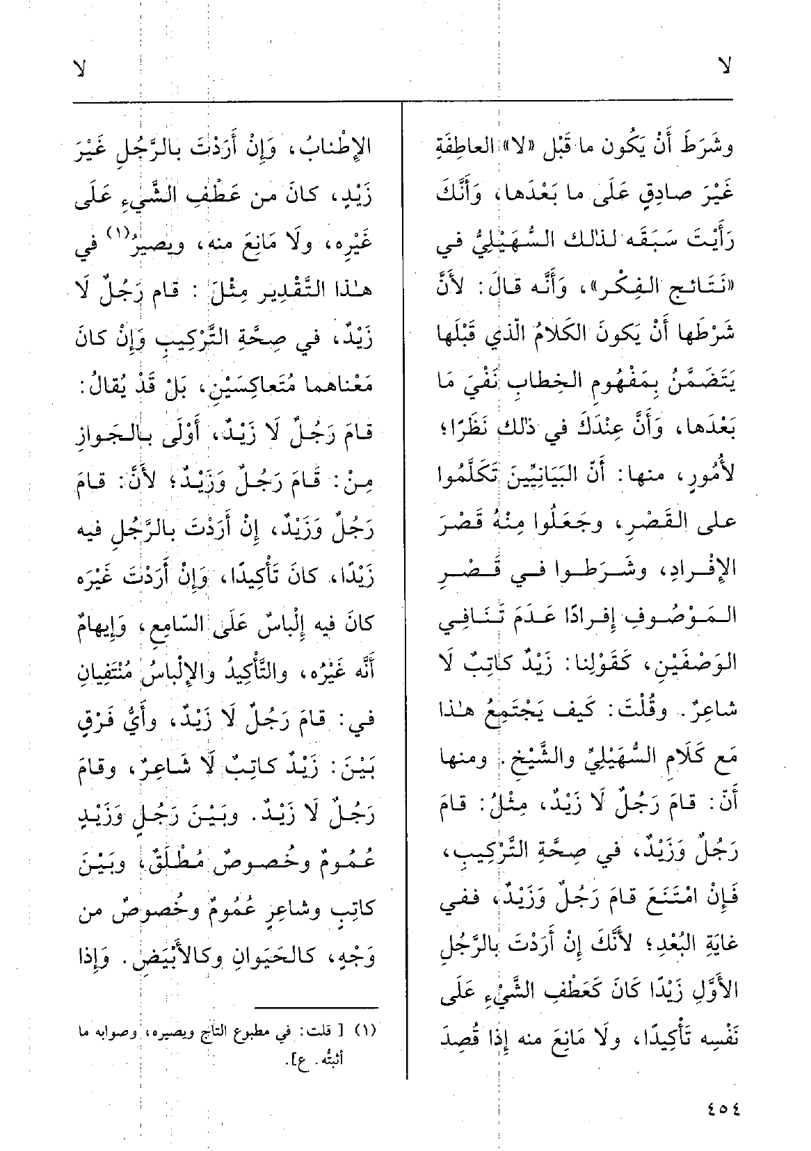 وشَرَط أَن يكونَ مَا قَبْل لَا العَاطِفَة غَيْر صادِقٍ على مَا بَعْدَها، وأنَّك رأَيْتَ، سَبَقَه لذلكَ السَّهيلي فِي نَتائجِ الفكْر وأَنَّه قالَ: لأنَّ شَرْطَها أَنْ يكونَ الكَلامُ الَّذِي قَبْلها يَتَضَمَّن بمفْهُومِ الخِطابِ نَفْي مَا بَعْدَها وَإِن عِنْدَكَ فِي ذلكَ نَظَراً لأُمورِ مِنْهَا أنَّ البَيانِيِّين تكلَّموا على القَصْرِ وجَعَلُوا مِنْهُ قَصْر الإفْراد وشَرَطُوا فِي قَصْر المَوْصُوف إفْراداً عَدَم تَنافِي الوَصْفَيْن كَقَوْلِنَا: زَيْدٌ كاتِبٌ لَا شاعِرٌ، وقُلْت كيفَ يَجْتَمِع هَذَا مَعَ كَلامِ السَّهيلي والشَّيْخ، وَمِنْهَا إنْ قامَ رَجُلٌ لَا زَيْدٌ مِثْل قامَ رجُلٌ وزَيْدٌ فِي صحَّةِ التَّرْكيبِ، فَإِن امْتَنَعَ قامَ رجُلٌ وزَيْدٌ فَفِي غايَةِ البُعْدِ لأنّك إنْ أَرَدْتَ بالرَّجُل الأوَّل زَيْداً كانَ كعَطْفِ الشيءِ على نَفْسِه تَأْكيداً، وَلَا مانِعَ مِنْهُ إِذا قصدَ الإطْناب، وَإِن أَرَدْتَ بالرَّجُلِ غَيْرَ زَيْدٍ كانَ مِن عَطْفِ الشيءِ على غَيْرِه وَلَا مانِعَ مِنْهُ، ويُصَيّره فِي هَذَا التَّقْديرِ مِثْل قامَ رجُلٌ لَا زَيْد فِي صحَّةِ التَّرْكِيب؛ وإنْ كانَ مَعْناهُما مُتَعاكِسَيْن، بل قد يقالُ قامَ رجُلٌ لَا زَيْدٌ أَوْلى بالجَوازِ مِن قامَ رجُلٌ وزَيْدٌ؛ لأنَّ قامَ رجُلٌ وزَيْدٌ إنْ أَرَدْتَ بالرَّجُلِ فِيهِ زَيْداً كانَ تَأْكيداً وإنْ أَرَدْتَ غَيْرَه كانَ فِيهِ إلباسٌ على السامِع، وإيهامٌ أَنَّه غَيْرُه، والتَّأْكيدُ والإلْباسُ مُنْتَفيانِ فِي قامَ رجُلٌ لَا زَيْدٌ، وأَيُّ فَرْقٍ بينَ زَيْدٌ كاتِبٌ لَا شاعِرٌ وقامَ رجُلٌ لَا زَيْدٌ وبينَ رَجُل وزَيْد عُمُومٌ وخُصُوصٌ مُطْلَقٌ وبينَ كَاتِب وشَاعِر عُمُوم وخُصُوص مِن وَجْه كالحَيَوانِ وكالأَبْيَض، وَإِذا