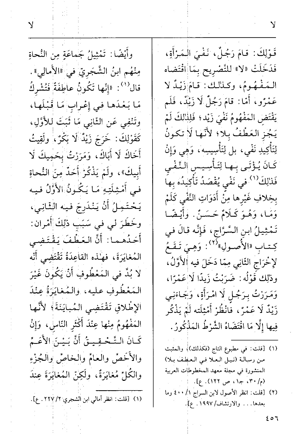 وأيْضاً تَمْثِيل جَماعَة مِن النُّحاة مِنْهُم ابْن الشَّجَري فِي الأمالِي قالَ: إنَّها تكونُ عاطِفَةً فتَشْركُ مَا بَعْدَها فِي إعْرابِ مَا قَبْلها وتَنْفي عَن الثَّانِي مَا ثَبَتَ للأوَّل كَقَوْلِك: خَرَجَ زَيْدٌ لَا بكر، ولَقِيتُ أَخاكَ لَا أَباكَ، ومَرَرْتُ بحَمِيكَ لَا أَبِيكَ، وَلم يَذْكُر أَحدٌ مِن النّحاةِ فِي أَمْثلتِه مَا كونُ الأوَّل فِيهِ يحتملُ أَن يَنْدرجَ فِيهِ الثَّانِي، وخَطَرَ لي فِي سَبَبِ ذلكَ أَمْران: أَحَدُهما: أَنَّ العَطْفَ يَقْتَضِي المُغايَرَةَ، فَهَذِهِ القاعِدَةُ تَقْتَضِي أنَّه لَا بُدَّ فِي المَعْطوفِ أنْ يكونَ غَيْرَ المَعْطوفِ عَلَيْهِ، والمُغايَرَةُ عنْدَ الإطْلاقِ تَقْتَضِي المُبايَنَةَ لأنَّها المَفْهومُ مِنْهَا عنْدَ أَكْثَر الناسِ وإنْ كانَ التَّحْقيقُ أنَّ بينَ الأعَمِّ والأخَصِّ والعامِّ والخاصِّ والجُزْء، والكُلِّ مغايَرَةً، ولكنَّ المُغايَرَةَ عنْدَ