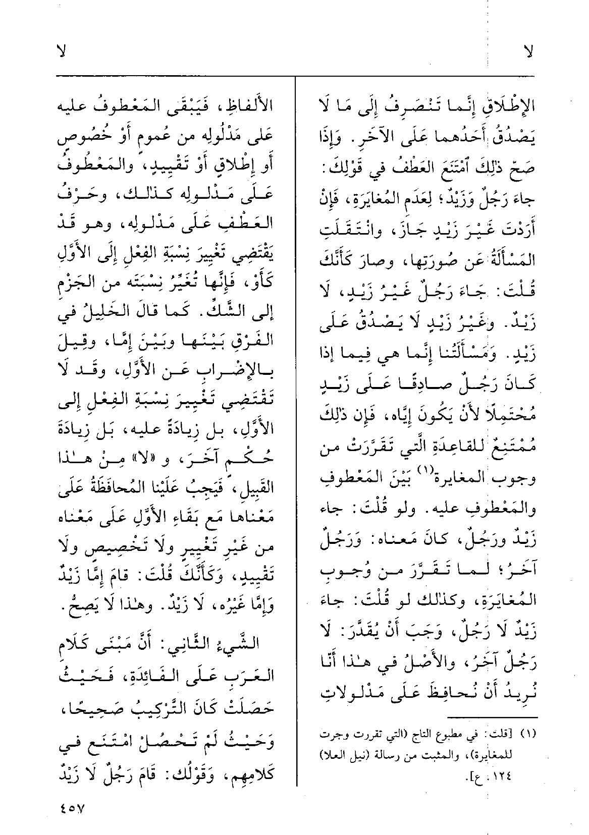 الإطْلاقِ إنَّما تَنْصرِفُ إِلَى مَا لَا يصدقُ أَحَدُهما على الآخرِ، وَإِذا صحَّ ذلكَ امْتَنَعَ العَطْفُ فِي قَوْلك جاءَ رجُلٌ وزَيْد لعَدَمِ المُغايَرَةِ، فَإِن أَرَدْتَ غَيْرَ زَيْدٍ جازَ وانْتَقَلَتِ المَسْأَلةُ عَن صُورتِها، وصارَ كأَنَّك قُلْتَ: جاءَ رجُلٌ غَيْر زَيْد لَا زَيْد، وغَيْر زَيْد لَا يصدقُ على زَيْد ومَسْأَلَتُنا إنَّما هِيَ فيمَا اذا كانَ رجُلٌ صادِقاً على زيْدٍ مُحتملاً لأنْ يكونَ إيَّاه، فإنَّ ذلكَ مُمْتَنِع للقاعَدِةِ الَّتِي تَقَرَّرْتْ وجَرَتْ للمُغايَرَةِ بينَ المَعْطوفِ والمَعْطوفِ عَلَيْهِ، وَلَو قُلْتَ جاءَ زَيْدٌ ورَجُل كانَ مَعْناهُ ورَجُل آخَر لمَا تقرَّرَ مِن وُجوبِ المُغايرَةِ، وكَذلكَ لَو قلْتَ جاءَ زَيْدٌ لَا رَجُل وَجَبَ أَن يقدَّرَ لَا رَجُلٌ آخَرُ، والأصْلُ فِي هَذَا أنَّا نُريدُ أَنْ نُحافِظَ على مَدْلولاتِ الألْفاظِ فيَبْقى المَعْطوفُ عَلَيْهِ على مَدْلُولِه مِن عُمُومٍ أَو خُصوصٍ أَو إطْلاقٍ أَو تَقْييدٍ، والمَعْطوفُ على مَدْلُولهِ كذلكَ، وحَرْفُ العَطْفِ على مَدْلُولِه وَهُوَ قد يَقْتَضِي تَغْيير نِسْبَة الفِعْل إِلَى الأوَّل كأوْ فإنَّها تغيِّرُ نِسْبَته مِنَ الجَزْمِ إِلَى الشَّكِّ كَمَا قالَ الخليلُ فِي الفَرْقِ بَيْنها وبينَ أما، وقيلَ بالإضْرابِ عَن الأوَّل، وَقد لَا تَقْتَضِي تَغْيير نِسْبَة الفِعْل إِلَى الأوَّلِ بل زِيادَة عَلَيْهِ، بل زِيادَة حُكْم آخر وَلَا مِن هَذَا القَبِيل فيجبُ علينا المُحافَظَة على مَعْناها مَعَ بَقاءِ الأوَّل على مَعْناهُ مِن غَيْرِ تَغْييرٍ وَلَا تَخْصيصٍ وَلَا تَقْييدٍ، كأَنَّك قلْتَ قامَ إمَّا زَيْدٌ وإمَّا غيرُه لَا زَيْد، وَهَذَا لَا يصحُّ. الشيءُ الثَّانِي أنَّ مَبْنى كَلامِ العَرَبِ على الفائِدَةِ فَحيثُ حَصَلَتْ كانَ التَّرْكِيبُ صَحِيحاً، وَحَيْثُ لم تَحْصَل امْتَنَع فِي كَلامِهم، وقَوْلك قامَ رجُلٌ لَا زَيْد