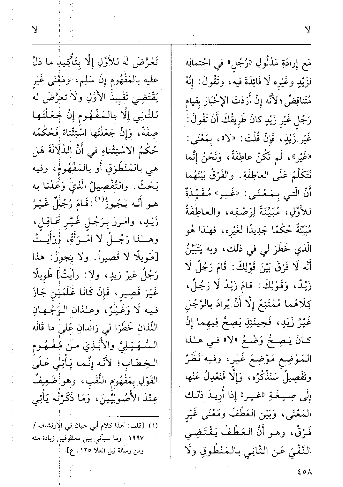 مَعَ إرادَةِ مَدْلُول رَجُل فِي احْتِمالِه لزَيْد وغَيْره لَا فائِدَةَ فِيهِ، ونقولُ أنَّه مُتنَاقِضٌ لأنَّه إِن أَرَدْتَ الإخبْارَ بنَفْي قِيامِ زَيْد وبالإخْبار بقِيامِ رجُلٍ المُحْتمل لَهُ ولغيْرِه كانَ مُتَناقِضاً، وَإِن أَرَدْتَ الإخْبارَ بقِيامِ رجُلٍ غَيْر زَيْد كَانَ طَرِيقُك أَنْ تقولَ غَيْر زَيْد، فَإِن قُلْتَ لَا بمعْنَى غَيْر لم تَكُنْ عاطِفَةً، ونحنُ إنَّما نَتَكلَّمُ على العَاطِفَةِ، والفَرْقُ بَيْنهما أنَّ الَّتِي بمعْنَى غَيْر مُقَيّدَةٌ للأُولى مُبَيِّنَةٌ لوَصْفِه، والعاطِفَة مُبَيِّنة حُكماً جَدِيداً لغَيْرِه، فَهَذَا هُوَ الَّذِي خَطَرَ لي فِي ذلكَ وَبِه يُتَبَيَّنُ أنَّه لَا فَرْقَ بينَ قَوْلك قامَ رَجُلٌ لَا زَيْد، وقَوْلك قامَ زَيْدٌ لَا رَجُل، كِلاهُما مُمْتَنِعٌ إلاَّ أَن يُرادَ بالرَّجُلِ غَيْرُ زَيْدٍ فحينَئِذٍ يصحُّ فيهمَا إنْ كانَ يصحُّ وَضْع لَا فِي هَذَا المَوْضِع مَوْضِع غَيْر وَفِيه نَظَرٌ وتَفْصيلٌ سنَذْكُره، وإلاَّ فنَعْدلُ عَنْهَا إِلَى صِيغَةِ غَيْر إِذا أُرِيدَ ذلكَ المَعْنى.