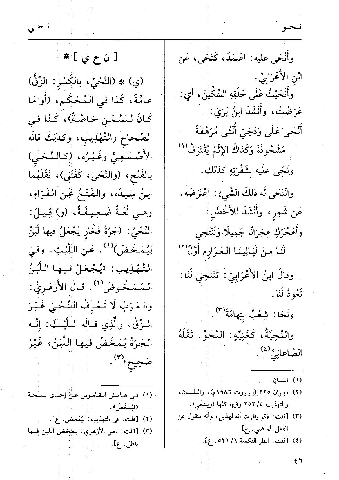 قَالَ الأزْهري: والعَرَبُ لَا تَعْرفُ النِّحْيَ غَيْر الزِّقِّ، وَالَّذِي قالَهُ اللّيْث إنَّه الجرَّةُ يُمْخَضُ فِيهَا اللَّبَنُ غَيْرُ صَحِيحٍ.