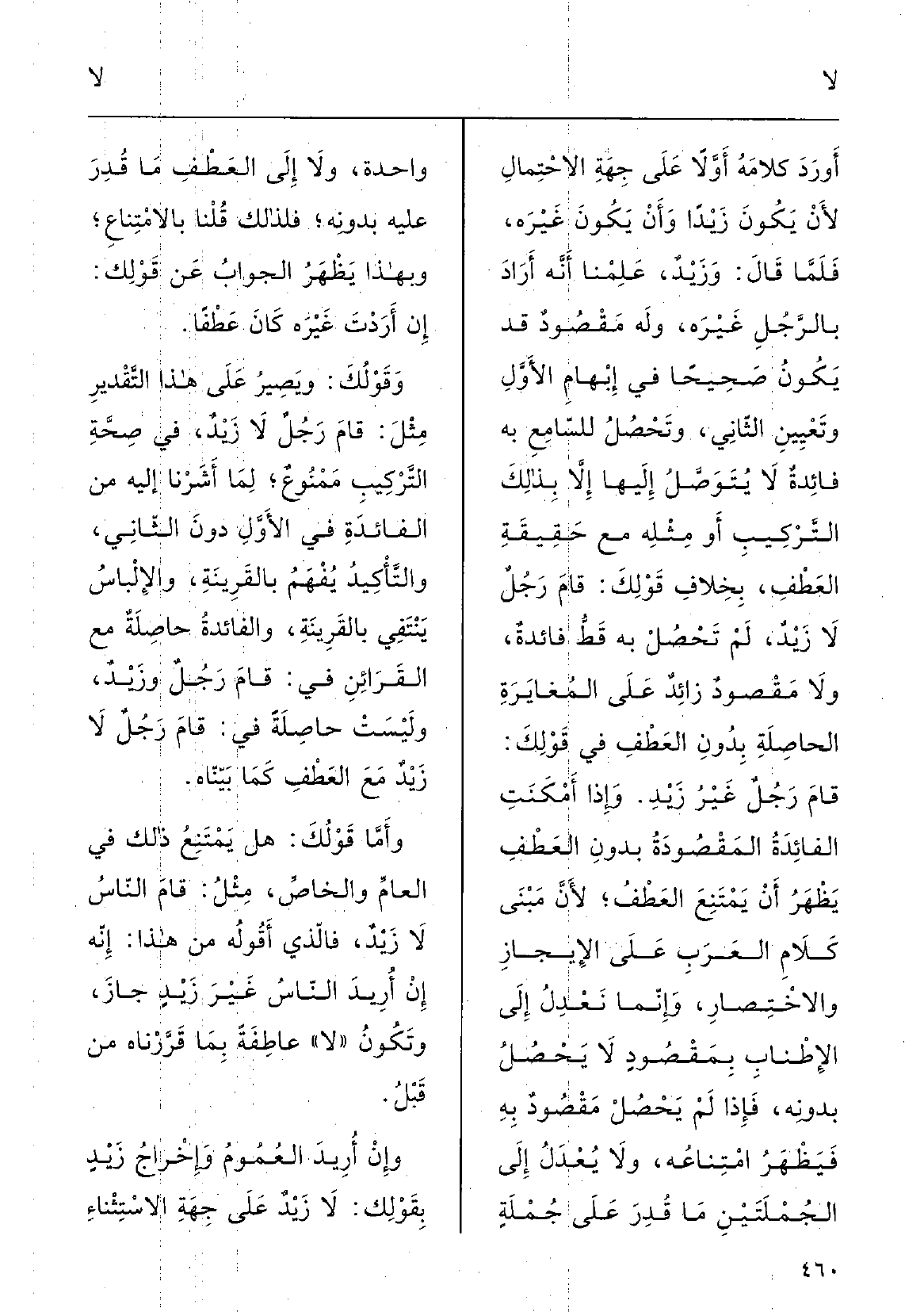 أَوْردَ كَلامَه أَوَّلاً على جِهَةِ الاحْتمالِ لأنْ يكونَ زَيْداً، وَأَن يكونَ غَيْرَه، فلمَّا قالَ وزَيْد عَلِمْنا أنَّه أَرادَ بالرَّجُلِ غَيْرَه وَله مَقْصودٌ قد يكونُ صَحِيحاً فِي إبهامِ الأوَّل وتَعْيين الثَّانِي، وتَحْصَل للسَّامِع بِهِ فائِدَةٌ لَا يُتَوَصَّل إِلَيْهَا إلاَّ بذلكَ التَّرْكيبِ أَو مِثْلِه مَعَ حَقِيقَةِ العَطْف بخِلافِ قَوْلِك قامَ رَجُلٌ لَا زَيْد لم تَحْصَل بِهِ قطّ فائِدَة وَلَا مَقْصُود زائِدٌ على المُغايرَةِ الحاصِلَةِ بدُون العَطْفِ فِي قَوْلِكَ قامَ رَجُلٌ غَيْرِ زَيْد، وَإِذا أَمْكَنتِ الفائِدَةُ المَقْصودَةُ بدُون العَطْفِ يَظْهَرُ أَن يَمْتَنِعَ العَطْف لأنَّ مَبْني كَلامِ العَرَبِ على الإيجازِ والاخْتِصارِ، وإنَّما نَعْدلُ إِلَى الإطْنابِ بِمَقْصودٍ لَا يَحْصَلَ بدُونِه، فَإِذا لم يَحْصَلَ مَقْصُود بِهِ فيَظْهَر امْتِناعُه وَلَا يَعْدل إِلَى الجُمْلَتَيْن مَا قُدِّرَ على جملةٍ واحِدَةٍ، وَلَا إِلَى العَطْف مَا قُدِّرَ عَلَيْهِ بدُونهِ، فلذلِكَ قُلْنا بالامْتِناعِ، وَبِهَذَا يظْهر الجَواب عَن قَوْلِكَ إِن أَرَدْتَ غَيْرَه كانَ عَطْفاً، وقَوْلك ويُصير على هَذَا التَّقْدِيرِ مِثْل قامَ رَجُلٌ لَا زَيْد فِي صحَّةِ التَّرْكيبِ مَمْنُوعٌ لمَا أَشَرْنا إِلَيْهِ من الفائِدَةِ فِي الأوَّل دُونَ الثَّانِي، والتَّأْكِيد يُفْهَمُ بالقَرِينةِ والإلْباسُ يُنْتَفَى بالقَرِينَةِ والفائِدَةُ حاصِلَةٌ مَعَ القَرائِنِ فِي قامَ رَجُلٌ وزَيْدٌ وليسَتْ حاصِلَةً فِي قامَ رَجُلٌ لَا زَيْدِ مَعَ العَطْفِ كَمَا بَيَّناهُ؛ وأَمَّا قَوْلُكَ هَل يَمْتَنِعُ ذلكَ فِي العامِّ والخاصِّ مِثْل قامَ الناسُ لَا زَيْد، فَالَّذِي أَقُولُه مِن هَذَا إنَّه إِن أُرِيدَ النَّاس غَيْر زَيْد جازَ وتكونُ لَا عاطِفَةً بمَا قَرَّرْناهُ مِن قَبْل، وَإِن أُرِيدَ العُمُوم وإخْراج زَيْد بقَوْلِكَ لَا زَيْد على جِهَةِ الاسْتِثْناءِ