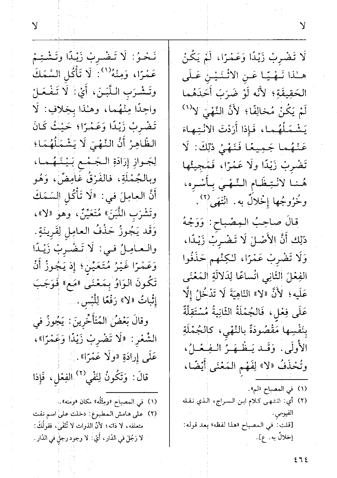 قَالَ صاحِبُ المِصْباح: ووَجْهُ ذلكَ أنَّ الأصْلَ لَا تَضْرِبْ زَيْداً وَلَا تَضْرِبْ عَمْراً لكنَّهم حذَفُوا الفِعْلَ الثَّانِي اتِّساعاً لدَلالَةِ المعْنى عَلَيْهِ، لأنَّ لَا النَّاهية لَا تَدْخُلُ إلاَّ على فِعْلٍ، فالجُمْلةُ الثانِيَةُ مُسْتقلةٌ بنَفْسِها مَقْصودَةٌ بالنَّهْي كالجُمْلةِ الأُولى، وَقد يَظْهَرُ الفِعْل وتُحْذَفُ لَا لفَهْم المَعْنى أَيْضاً نَحْو: لَا تَضْرِبْ زَيْداً وتَشْتم عَمْراً، وَمِنْه: لَا تأْكُلِ السَّمَك وتَشْرَب اللَّبَنَ، أَي لَا تَفْعَل واحِداً مِنْهُمَا؛ وَهَذَا بخِلافِ لَا تَضْربْ زَيْداً وعَمْراً حيثُ كانَ الظاهِرُ أَنَّ النَّهْي لَا يَشْملُهما لجَوازِ إرادَةِ الجَمْعِ بَيْنهما، وبالجُمْلةِ فالفَرْقُ غامِضٌ وَهُوَ أنَّ العامِلَ فِي لَا تأْكُلِ السَّمك وتَشْرب اللّبن مُتَعينٌ وَهُوَ لَا، وَقد يجوز حَذْف العامِلِ لقَرِينَةٍ، والعامِلُ فِي لَا تَضْرِب زَيْداً وعَمْراً غَيْرُ مُتَعّين إِذْ يَجوزُ أَنْ تكونَ الْوَاو بمعْنَى مَعَ فوَجَب إثْبات لَا رفْعاً للَّبْسِ؛ وَقَالَ بعضُ المُتَأخِّرين: يجوزُ فِي الشِّعْر لَا تَضْرِبْ زَيْداً وعَمْراً على إرادَةِ وَلَا عَمْراً؛ قالَ: وتكونُ لنَفْي الفِعْل، فَإِذا
