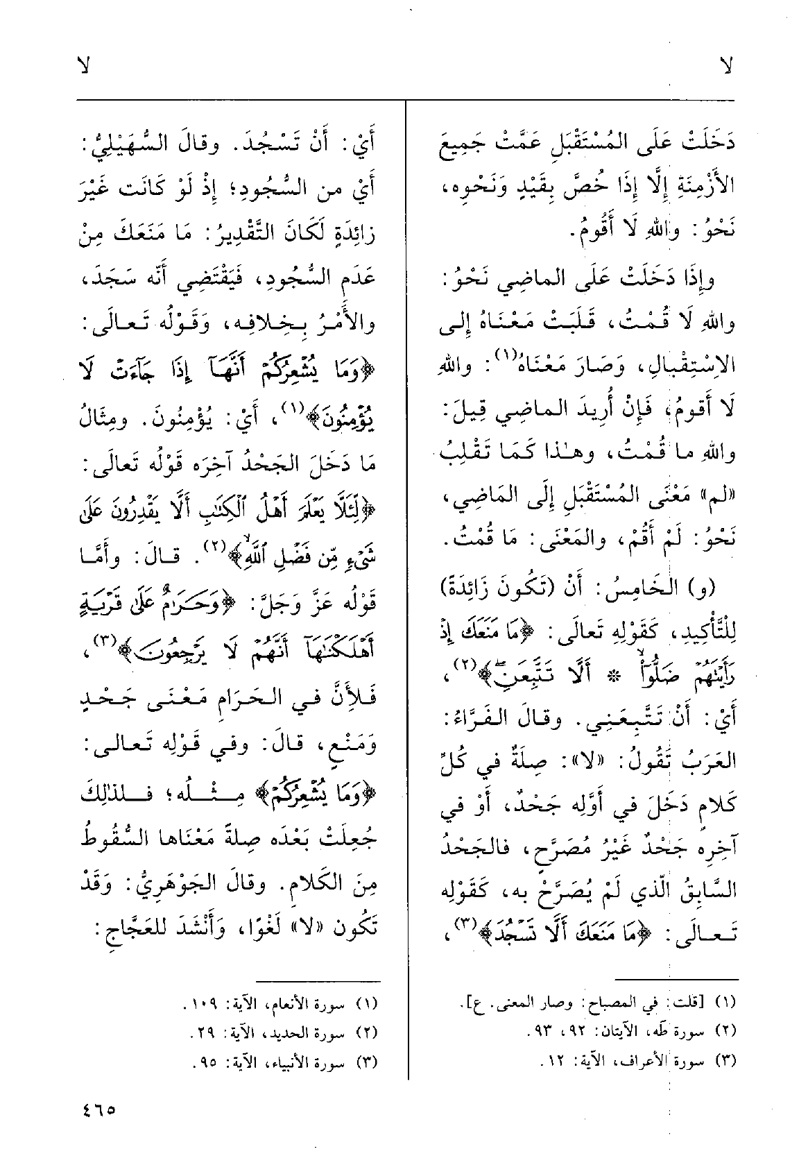 وَقَالَ السّهيلي: أَي من السُّجودِ إِذْ لَو كانتْ غَيْر زائِدَةٍ لكانَ التَّقْديرُ مَا مَنَعَك مِن عَدَمِ السُّجودِ فيَقْتَضِي أنَّه سَجَدوا لأَمْرٍ بخِلافِه؛ وَقَوله تَعَالَى: {وَمَا يُشْعِرُكُم أَنَّها إِذا جاءَتْ لَا يُؤْمِنُون} ، أَي يُؤْمِنُون.