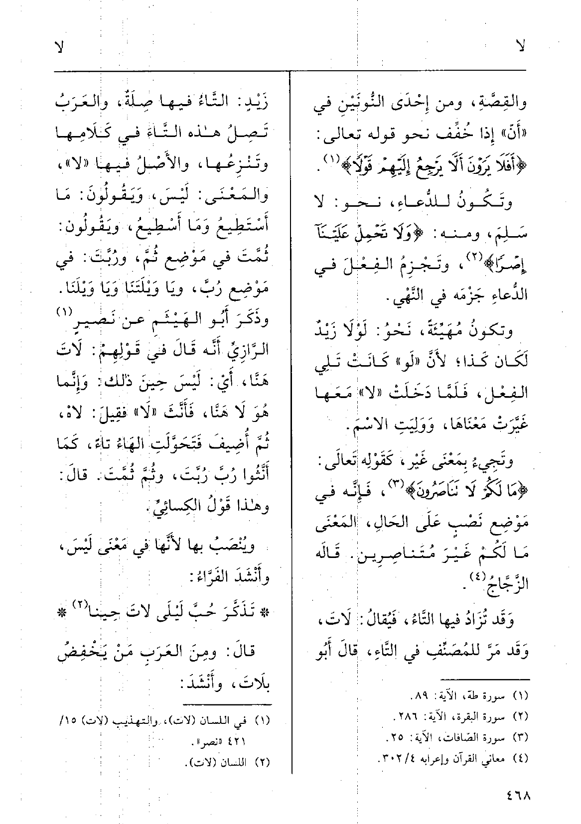 قَالَ أَبو زَيْدٍ: التاءُ فِيهَا صِلَةٌ، والعَرَبُ تَصِلُ هَذِه التَّاء فِي كَلامِها وتَنْزِعُها؛ والأصْلُ فِيهَا لَا، والمَعْنى لَيْسَ، وَيَقُولُونَ: مَا أَسْتَطِيعُ وَمَا أَسْطِيعُ، وَيَقُولُونَ ثُمَّتَ فِي مَوْضِع ثُمَّ، ورُبَّتَ فِي موضِع رُبَّ، وَيَا وَيْلَتنا وَيَا وَيْلنا.