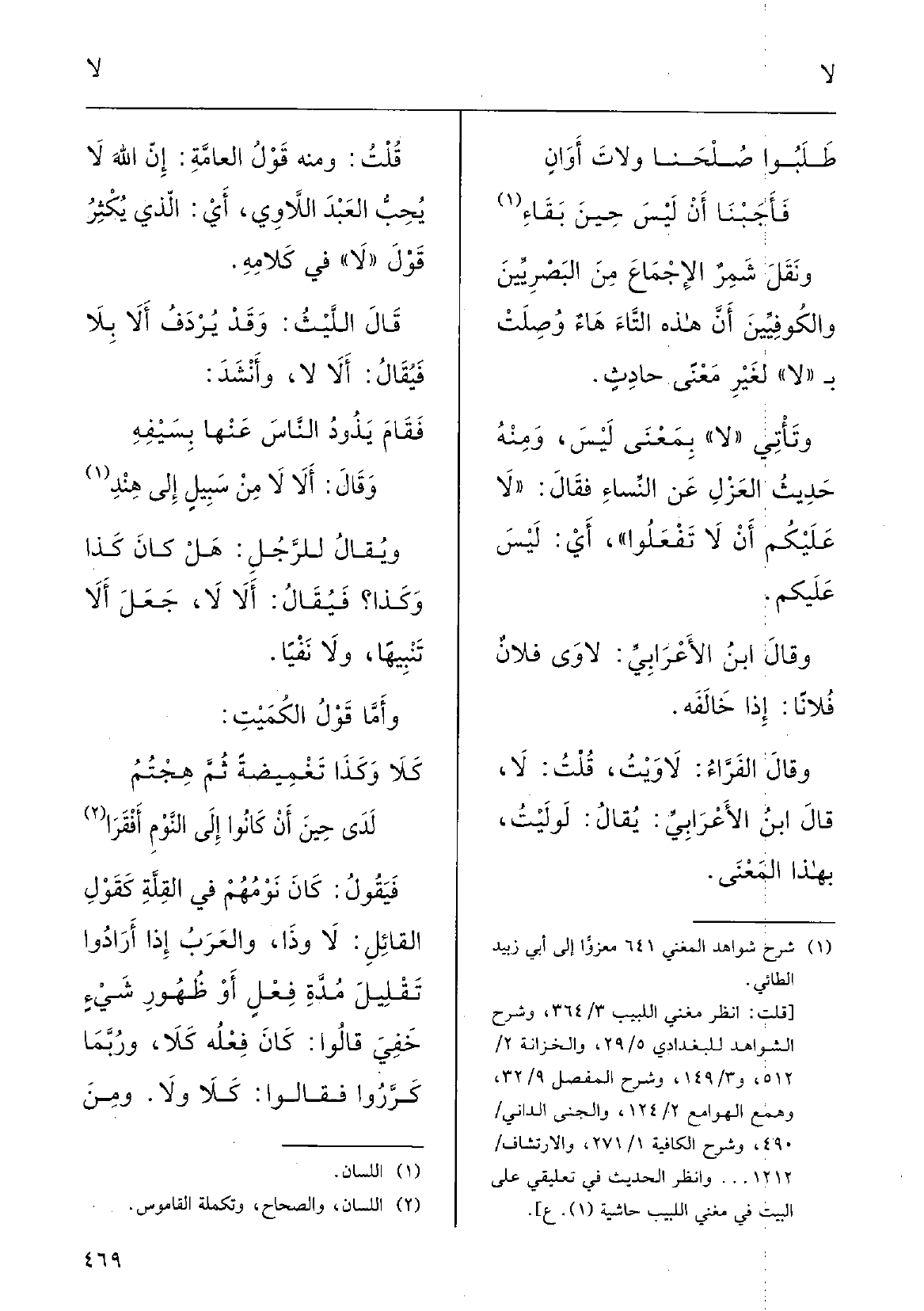 فأَجْبنا أَنْ ليسَ حِينَ بَقاءِونقلَ شَمِرٌ الإجْماعَ مِن البَصْرِيِّين والكُوفيِّين أَنَّ هَذِه التَّاءَ هاءٌ وُصِلَتْ بِلا لغَيْرِ مَعْنًى حادِثٍ.