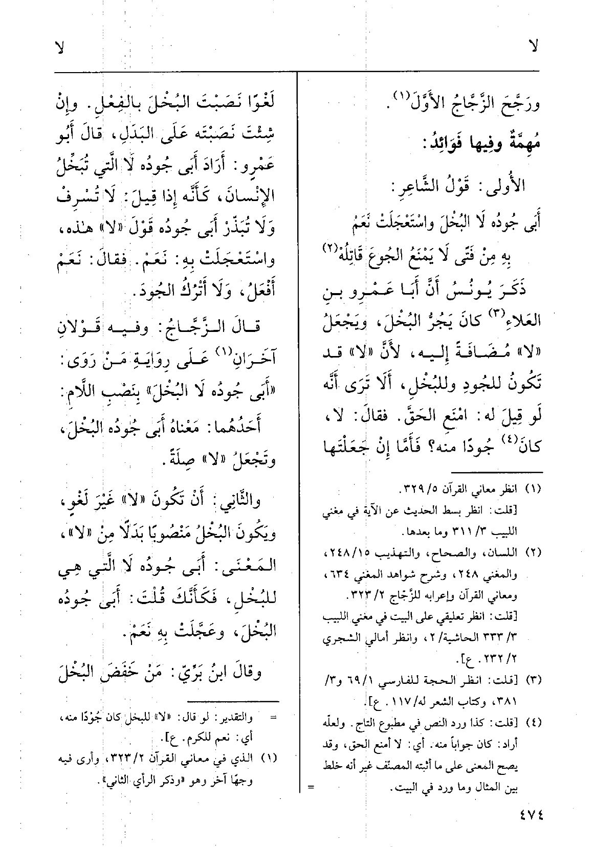 قَالَ الزجَّاجُ: وَفِيه قولانِ آخَرانِ على رِوايَةِ مَنْ رَوَى أَبَى جُودُه لَا البُخْل بنَصْبِ اللامِ: أَحَدُهما مَعْناه أَبَى جُودُه البُخْلَ وتَجْعل لَا صِلَةً؛ وَالثَّانِي: أَنْ تكونَ لَا غَيْرَ لَغْوٍ ويكونُ البُخْلُ مَنْصوباً بَدَلاً مِن لَا، المَعْنى أَبَى جُودُه لَا الَّتِي هِيَ للبُخْلِ، فكأَنَّك قُلْتَ أَبَى جُودُه البُخْلَ وعَجَّلَتْ بهِ نَعَم.