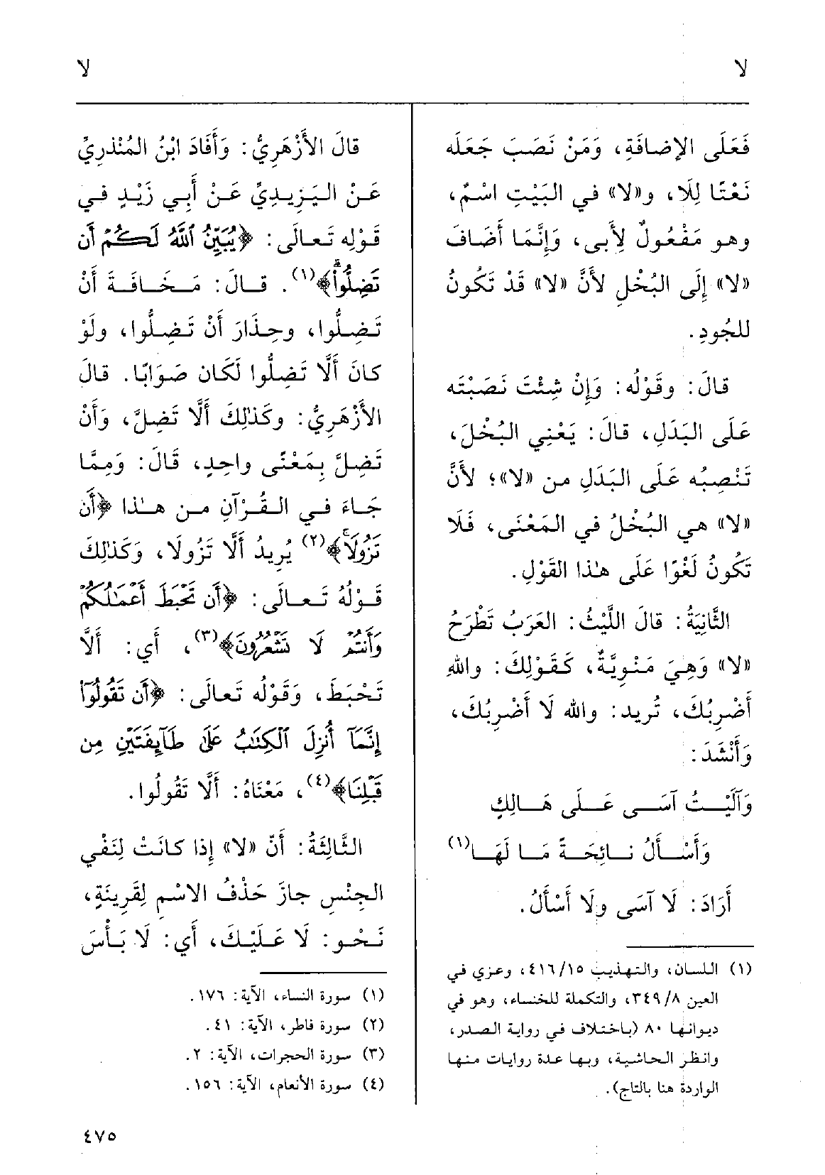 قَالَ الأزْهري: وأفادَ ابنُ المُنْذرِي عَن اليَزِيدِي عَن أَبي زيدٍ فِي قولهِ تَعَالَى: {يُبَيِّن ااُ لكُم أَن تَضِلُّوا} ، قَالَ: مَخَافَة أَن تَضِلُّوا وحِذارِ أَن تَضِلُّوا، وَلَو كانَ أَنْ لَا تَضِلُّوا لكانَ صَواباً؛ قَالَ الأزْهرِي: وكَذلكَ أَن لَا تَضِلَّ وأَنْ تَضِلَّ بمعْنًى واحِدٍ، قَالَ: وممَّا جاءَ فِي القُرْآنِ مِن هَذَا: {أَنْ تَزُولا} ، يُريدُ أَنْ لَا تَزُولا، وكَذلكَ قولهُ تَعَالَى: {أَن تَحْبَطَ أَعْمالُكُم وأَنْتُم لَا تَشْعُرونَ} ، أَي أَنْ لَا تَحْبَطَ؛ وقولُه تَعَالَى: {أَن تَقُولُوا إنَّما أُنْزِلَ الكِتابُ على طائِفَتَيْن مِن قَبْلنا} ؛ مَعْناه أَنْ لَا تَقولُوا.