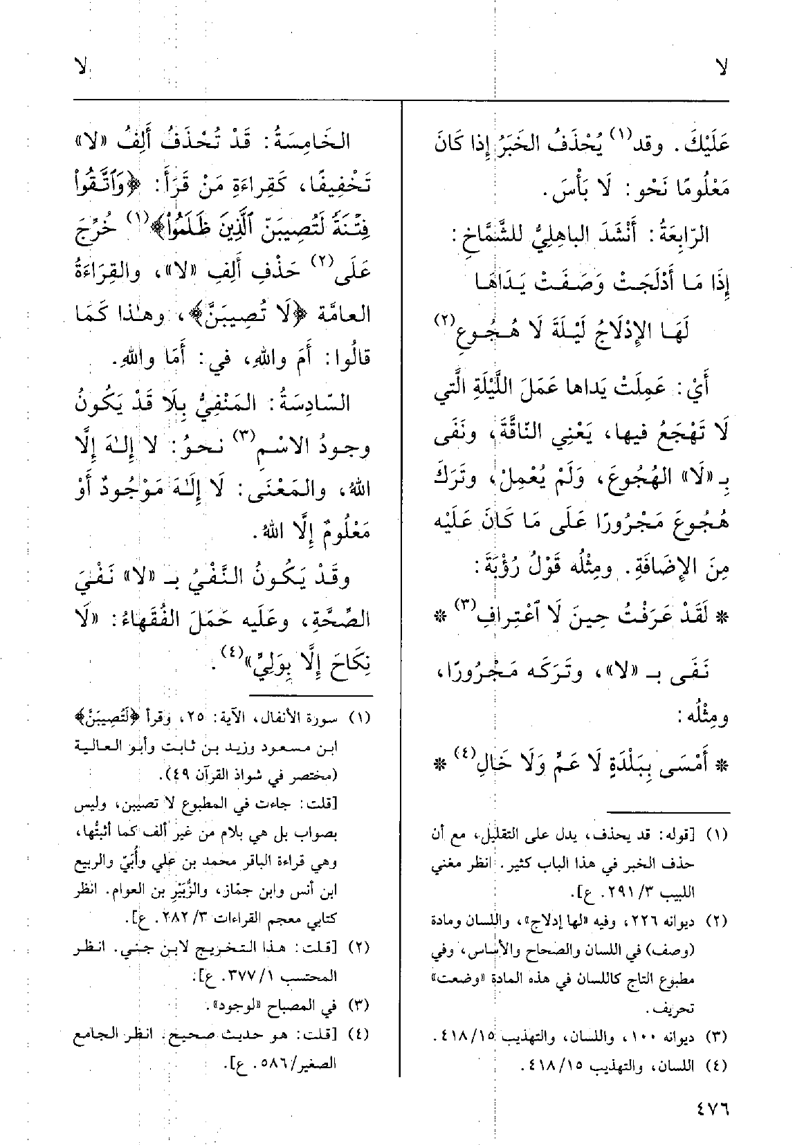 أَمْسَى ببَلْدَةِ لَا عَمَ وَلَا خالِ الخامِسةُ: قد تُحْذَفُ أَلفُ لَا تَخْفيفاً كقِراءَةِ مَنْ قَرَأَ: {واتَّقُوا فِتْنَةً لتصِيبَنَّ الَّذين ظَلَمُوا} ؛ خَرَّجَ على حَذْفِ أَلفِ لَا، والقِراءَةُ العامَّة لَا تصِيبَنَّ، وَهَذَا كَمَا قَالُوا أَم واللهاِ فِي أَما واللهاِ.