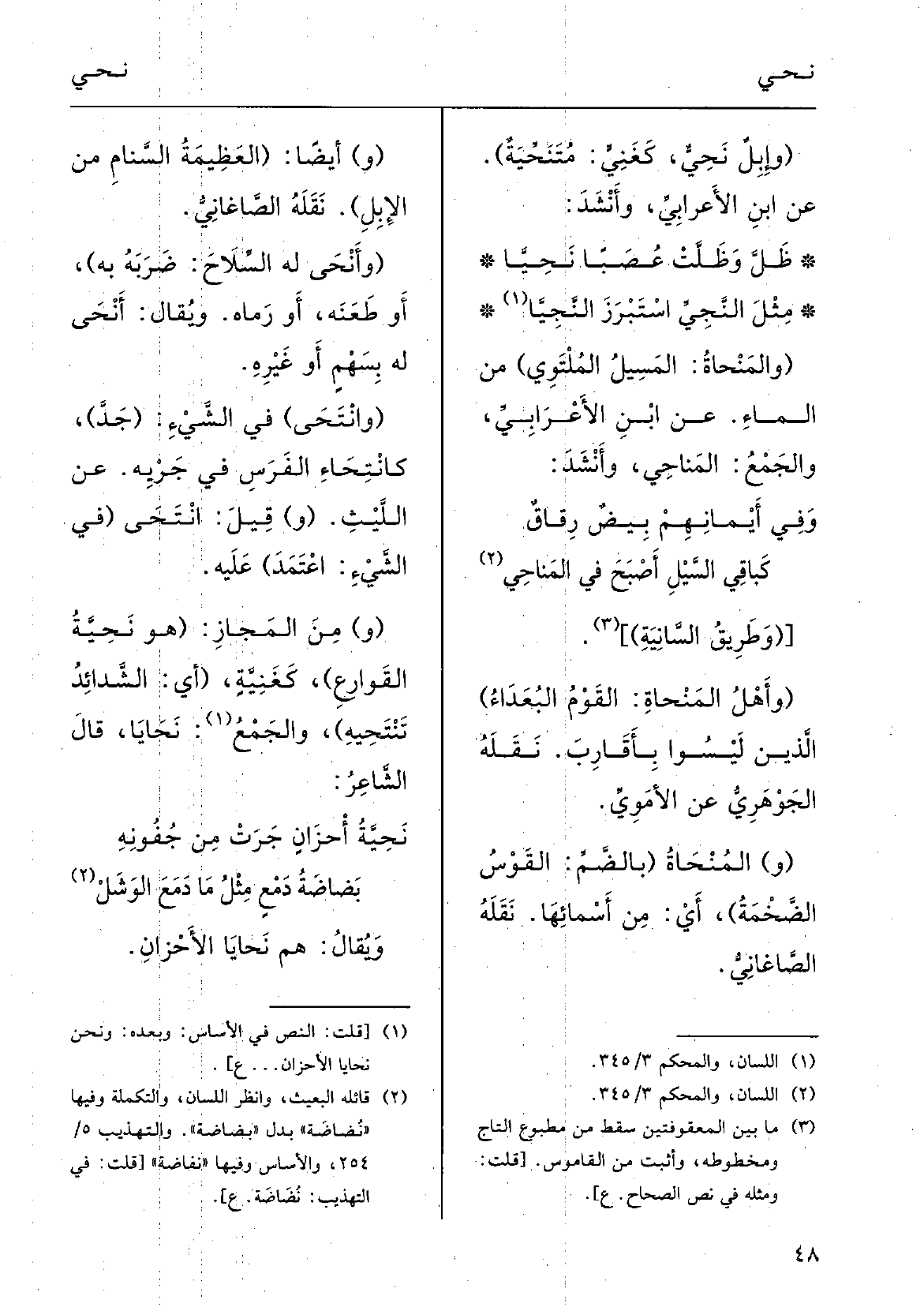 مثْلَ النَّجِيِّ اسْتَبْرَزَ النَّجِيَا (} والمَنْحاةُ: المَسِيلُ المُلْتَوِي) مِن الماءِ؛ عَن ابنِ الأعْرابي؛ والجَمْعُ {المَناحِي.